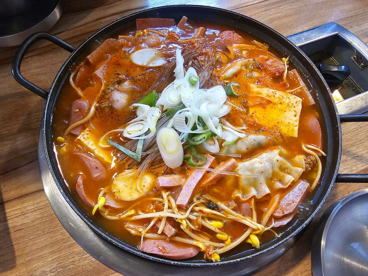 콩나물이 듬뿍 들어가 시원한 국물 맛을 내는 부대찌개다양하고 특별한 햄과 소시지가 가득한 모습