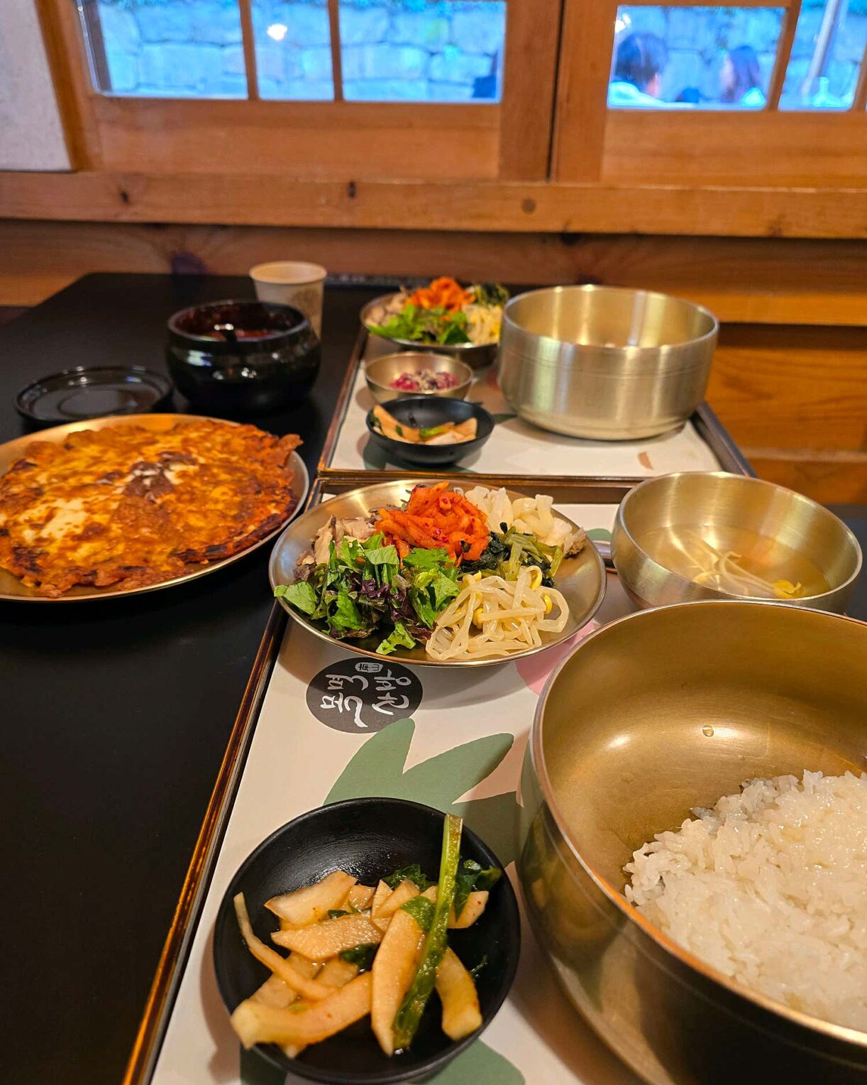 자리에 앉자마자 음식은 거의 바로 준비되어 나왔습니다. 시장이 반찬이라고 하지만, 눈앞에 차려진 음식들은 그 자체로 감탄을 자아냈습니다. 저희는 시그니처 메뉴라는 비빔밥을 종류별로 맛보고 싶어 육회비빔밥, 산방비빔밥, 불고기비빔밥을 주문하고, 곁들일 메뉴로 치즈김치전과 도토리묵, 그리고 제육까지 푸짐하게 시켰습니다.