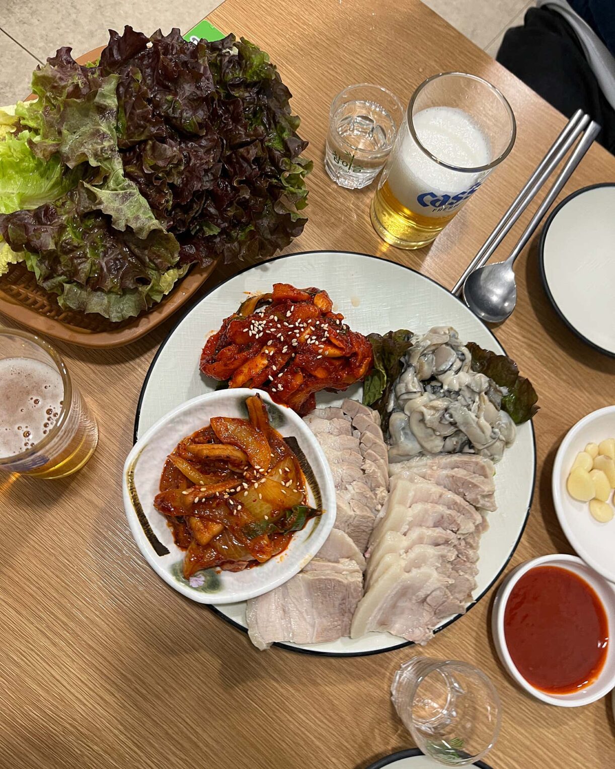 저희는 망설임 없이 굴보쌈을 주문했습니다. 곧이어 테이블에 차려진 비주얼은 그야말로 감탄을 자아냈습니다. 윤기가 좌르르 흐르는 보쌈고기와 바다향을 머금은 싱싱한 생굴, 그리고 보기만 해도 군침이 도는 보쌈김치까지. 소(小)자를 시켰음에도 양이 정말 푸짐해서 놀랐습니다. 이 모든 게 3만 2천 원이라니, 가성비가 정말 뛰어나다고 느꼈죠.