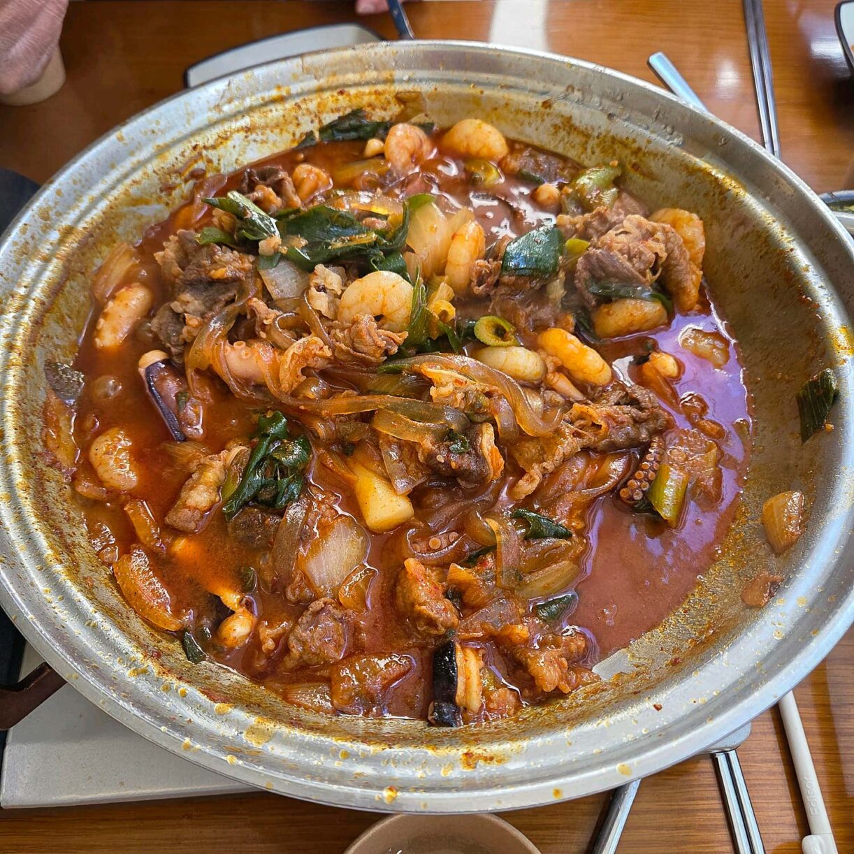 무엇보다 좋았던 건, 직원분이 수시로 테이블을 오가며 가장 맛있는 타이밍에 맞춰 직접 조리해주신다는 점이었습니다. 덕분에 저희는 편안하게 대화를 나누며 음식을 즐길 수 있었죠. 음식 향에 예민한 편인데도 낙지, 새우, 대창, 우삼겹 모두 잡내 하나 없이 신선함 그 자체였습니다. 부드럽게 씹히는 낙지와 쫄깃하고 고소한 대창의 풍미, 탱글하게 터지는 새우의 식감이 매콤달콤하면서도 깊고 진한 양념과 어우러져 환상의 조화를 이루었습니다.