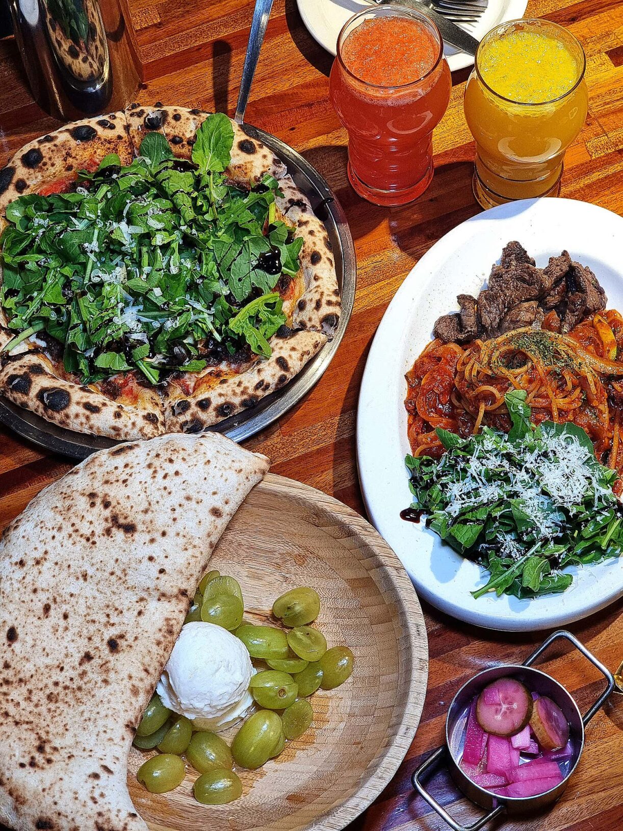 특히 함께 나오는 화덕빵이 예술입니다. 매일 아침 직접 반죽하고 저온 숙성시켜 고온의 화덕에서 순식간에 구워낸 도우는 겉은 바삭하고 속은 담백하면서도 쫄깃한 식감이 살아있어요. 이 빵에 꿀과 청포도, 리코타 치즈를 얹어 먹으면 입안에서 고소함과 달콤함, 상큼함이 한데 어우러져 춤을 춥니다. 크림치즈를 안 좋아하던 제 남자친구마저 반하게 만든 마성의 맛이었죠. 배가 불러도 계속 손이 가는, 중독성이 정말 미쳤다는 표현이 딱 맞습니다.