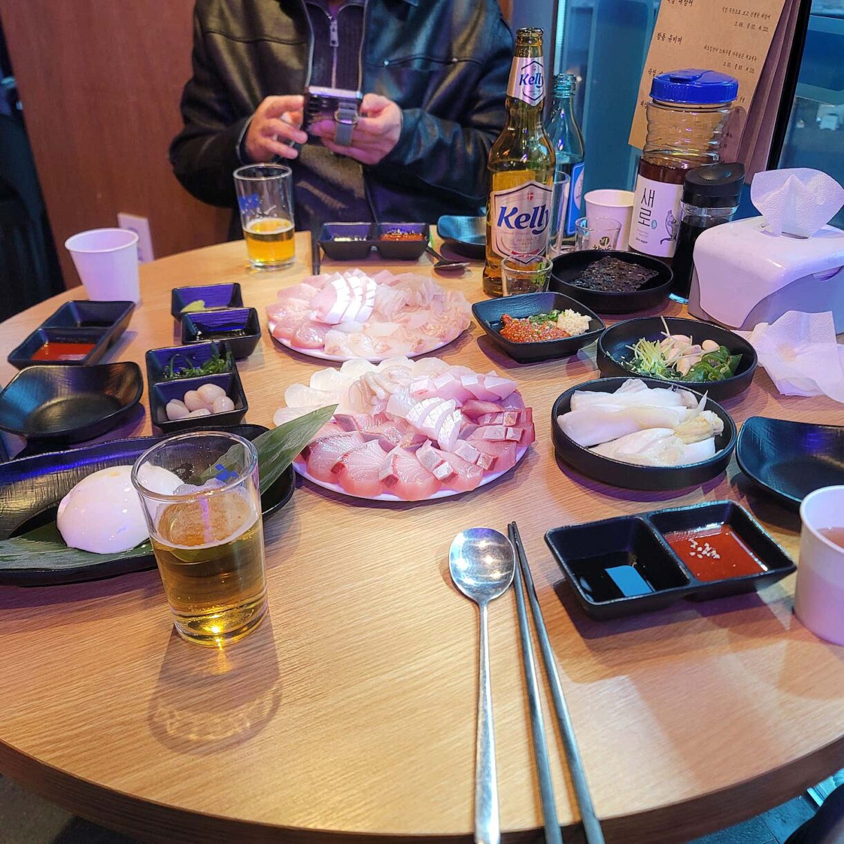 두툼한 회가 한가득 담겨있는 파도집의 모듬회육사시미와 다양한 곁들임 반찬이 함께 나온 상차림