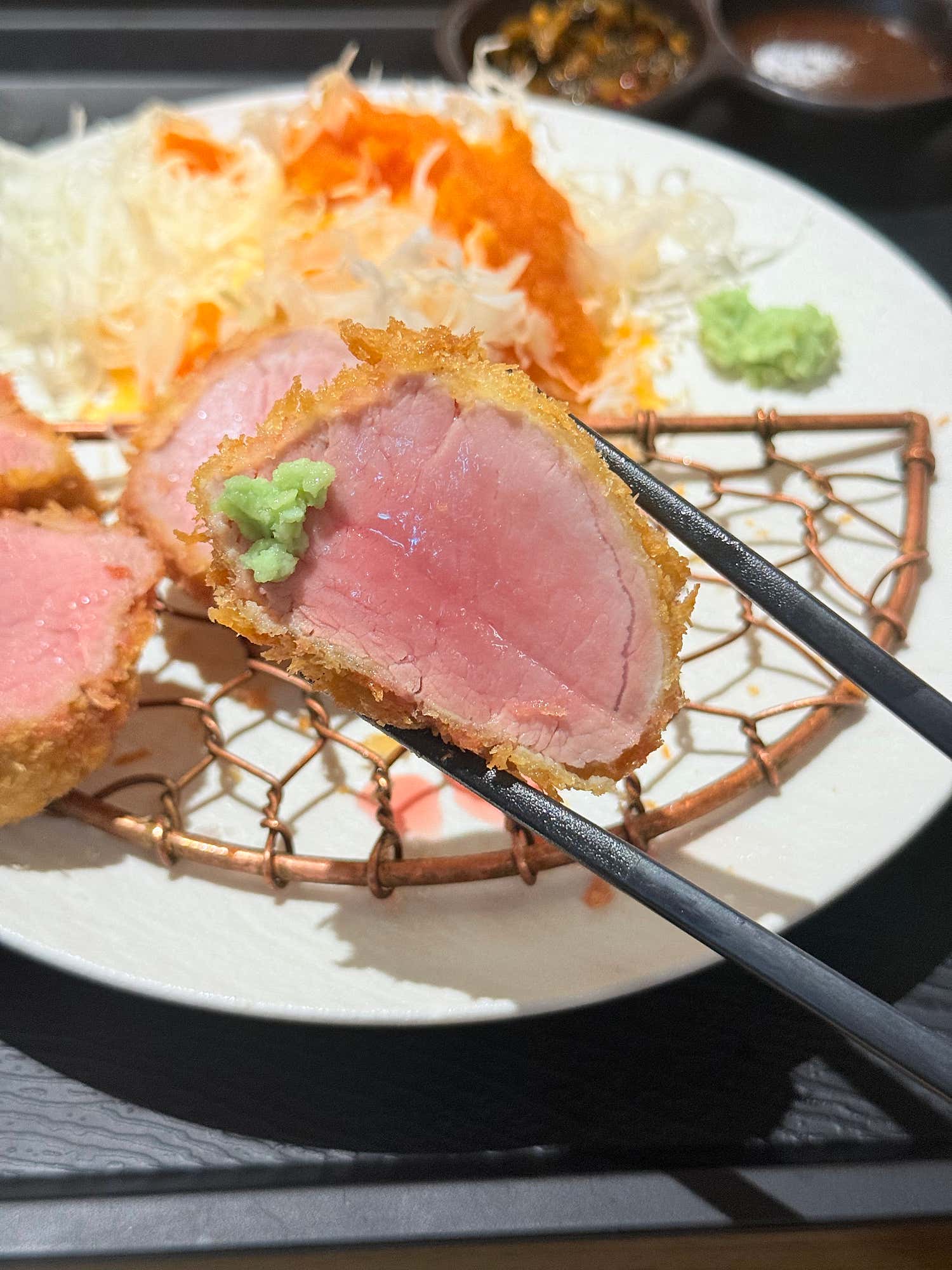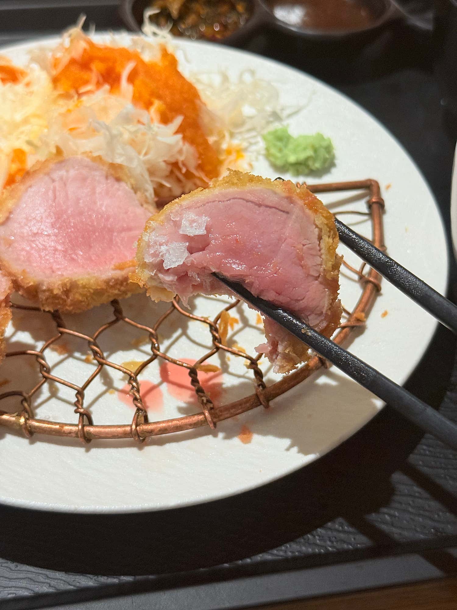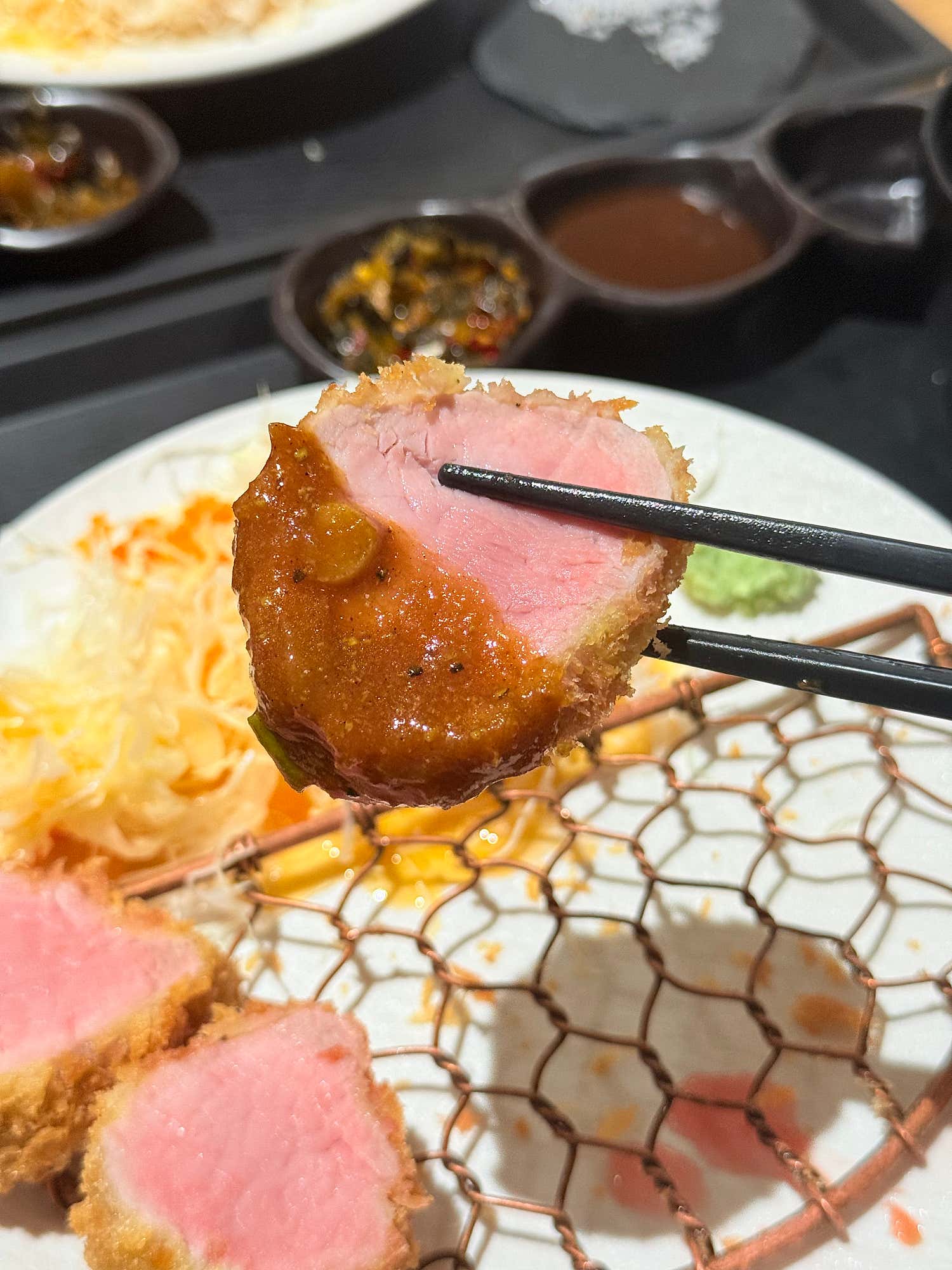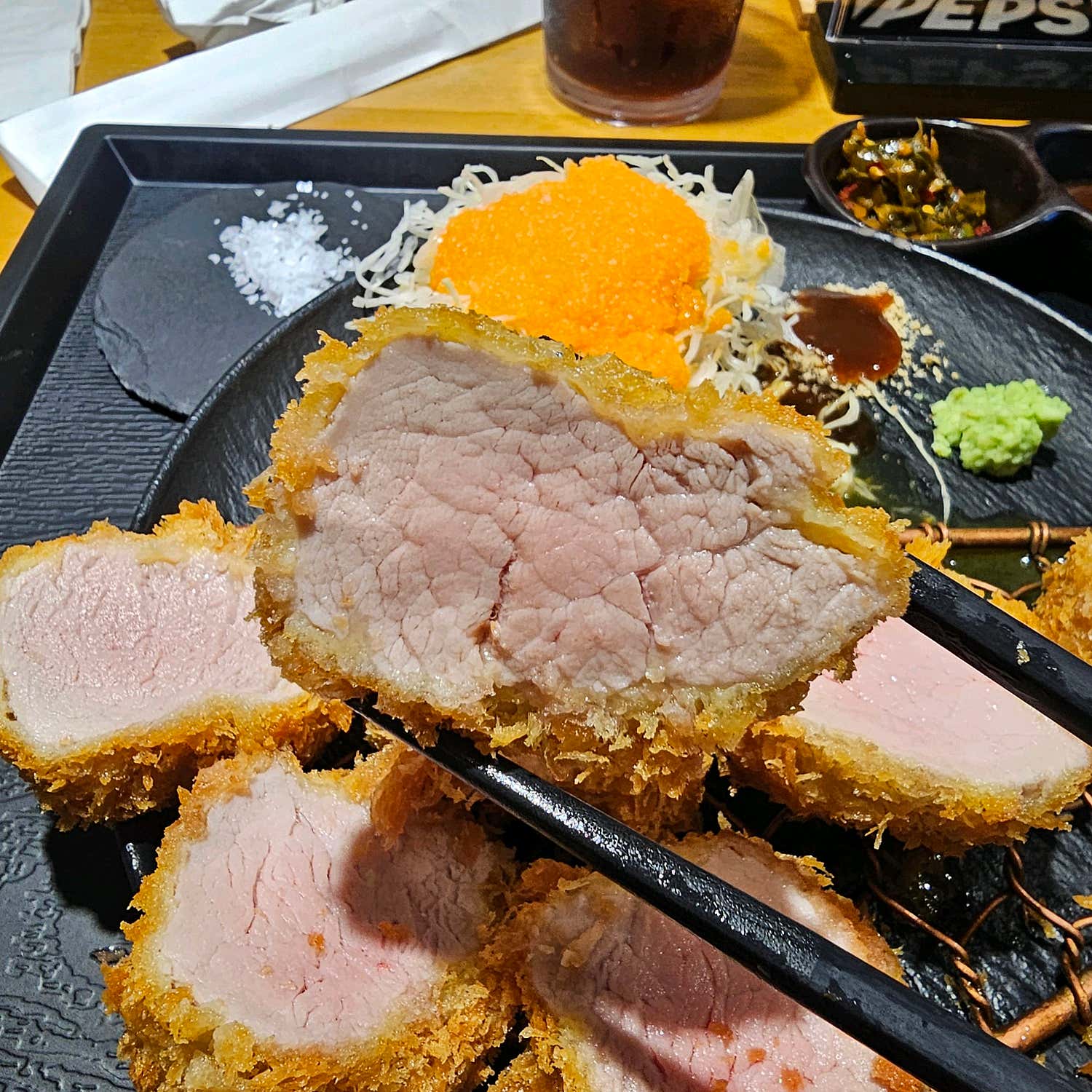 안심카츠 역시 그 명성에 걸맞은 훌륭한 맛을 선사했습니다. 완벽하게 조리된 익힘 정도는 아름다운 붉은빛을 살짝 띠면서도, 잡내 없이 깔끔한 맛을 자랑했어요. 겉은 바삭하고 속은 촉촉한 기본에 충실하면서도, 안심 고유의 부드러움을 극대화하여 입안에서 사르르 녹는 듯한 식감을 경험할 수 있었습니다. 소금만 살짝 찍어 먹어도 고기 본연의 깊은 맛이 고스란히 느껴져 그야말로 일품이었어요.
