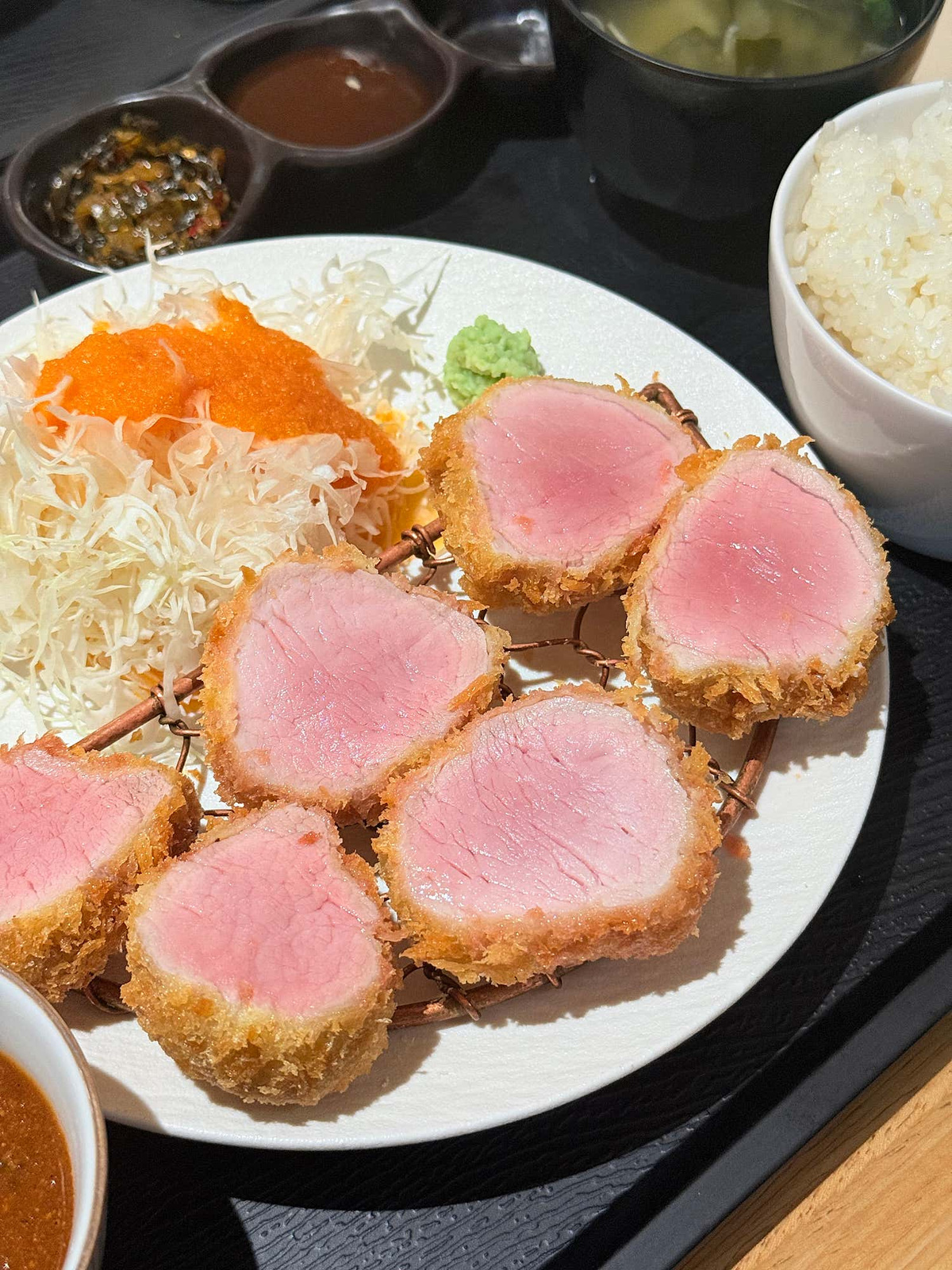 안심카츠 역시 그 명성에 걸맞은 훌륭한 맛을 선사했습니다. 완벽하게 조리된 익힘 정도는 아름다운 붉은빛을 살짝 띠면서도, 잡내 없이 깔끔한 맛을 자랑했어요. 겉은 바삭하고 속은 촉촉한 기본에 충실하면서도, 안심 고유의 부드러움을 극대화하여 입안에서 사르르 녹는 듯한 식감을 경험할 수 있었습니다. 소금만 살짝 찍어 먹어도 고기 본연의 깊은 맛이 고스란히 느껴져 그야말로 일품이었어요.