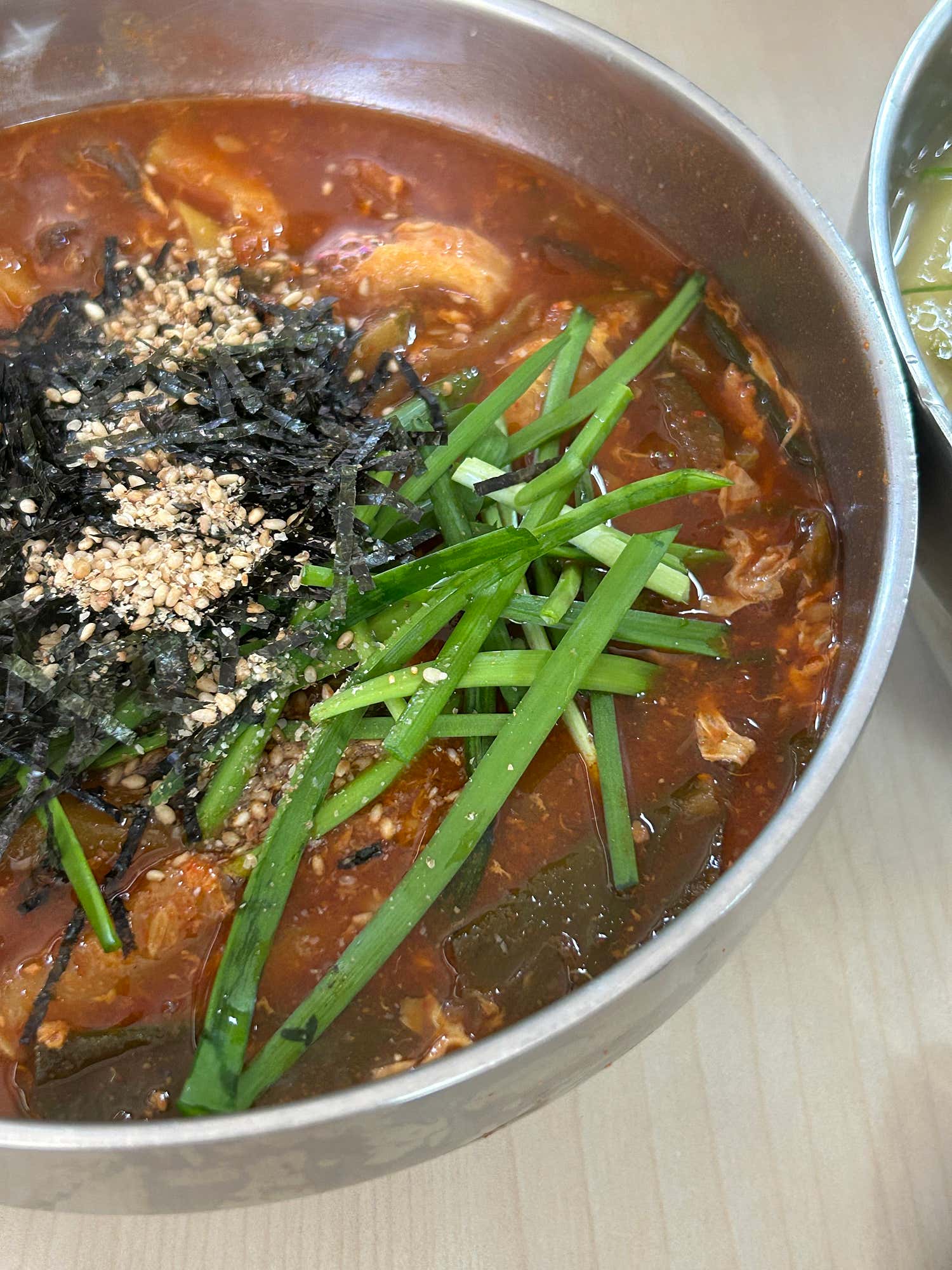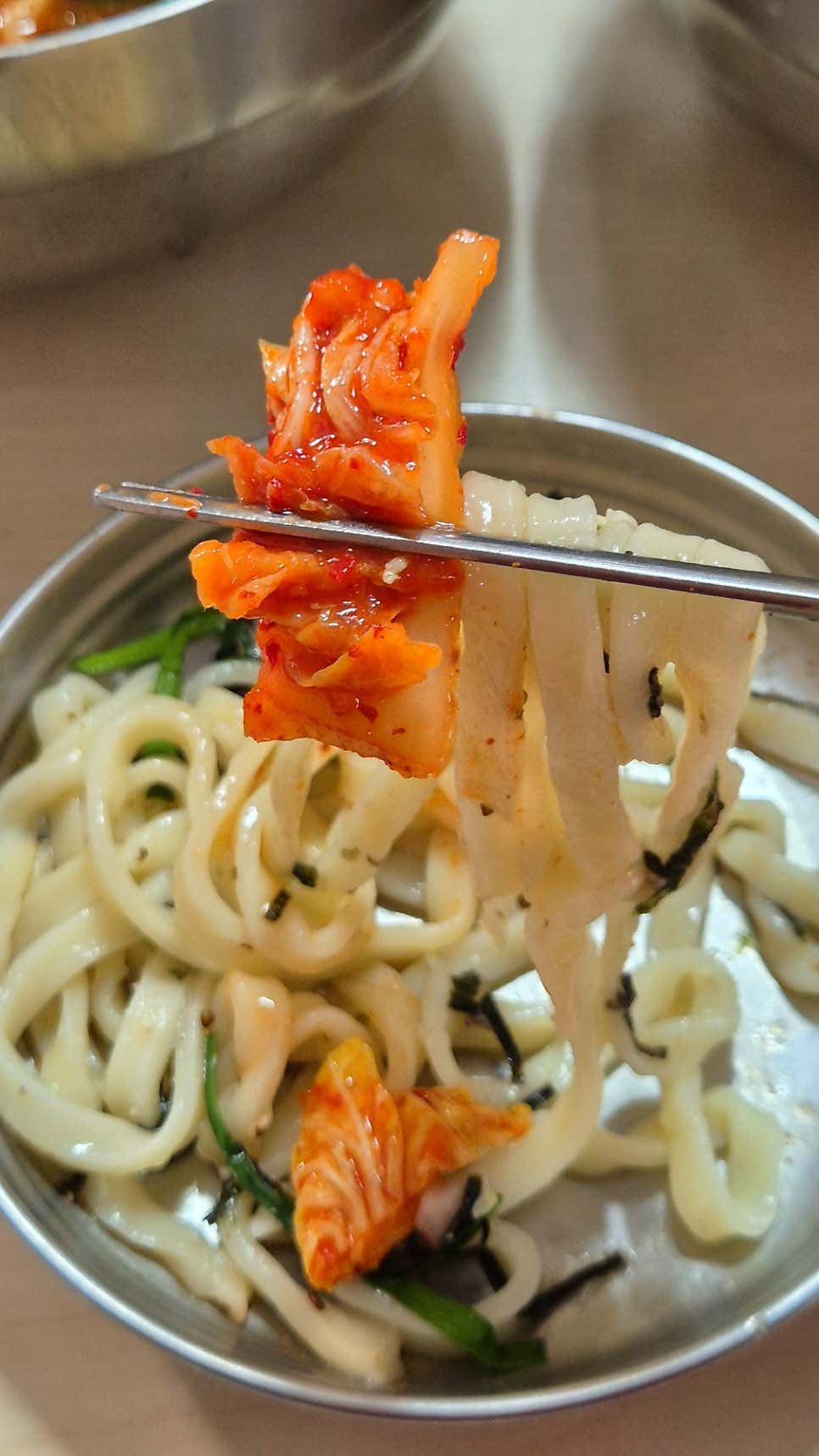드디어 메인 메뉴인 장칼국수가 등장했습니다. 붉은빛 국물이 식탁 위를 화려하게 물들이며 시각부터 압도합니다. 갓 나온 장칼국수에서 피어오르는 뜨거운 김 사이로, 진한 멸치육수의 구수함과 매콤한 고추장 양념의 칼칼한 향이 코끝을 스칩니다. 한 숟가락 떠보니, 그 깊이에 감탄이 절로 나옵니다.
