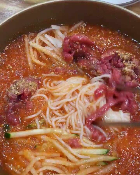 드디어 마주한 함양집의 시그니처, 한우물회입니다. 처음 먹어본다는 친구들도 있었지만, 한 숟가락 맛보는 순간 모두의 눈이 휘둥그레졌죠. 얼음 동동 띄워진 시원하고 매콤한 육수 위로 신선함이 극에 달한 육회가 소복하게 올라앉아 보기만 해도 침샘을 자극합니다. 그 어떤 미사여구로도 다 표현할 수 없는 이 맛!