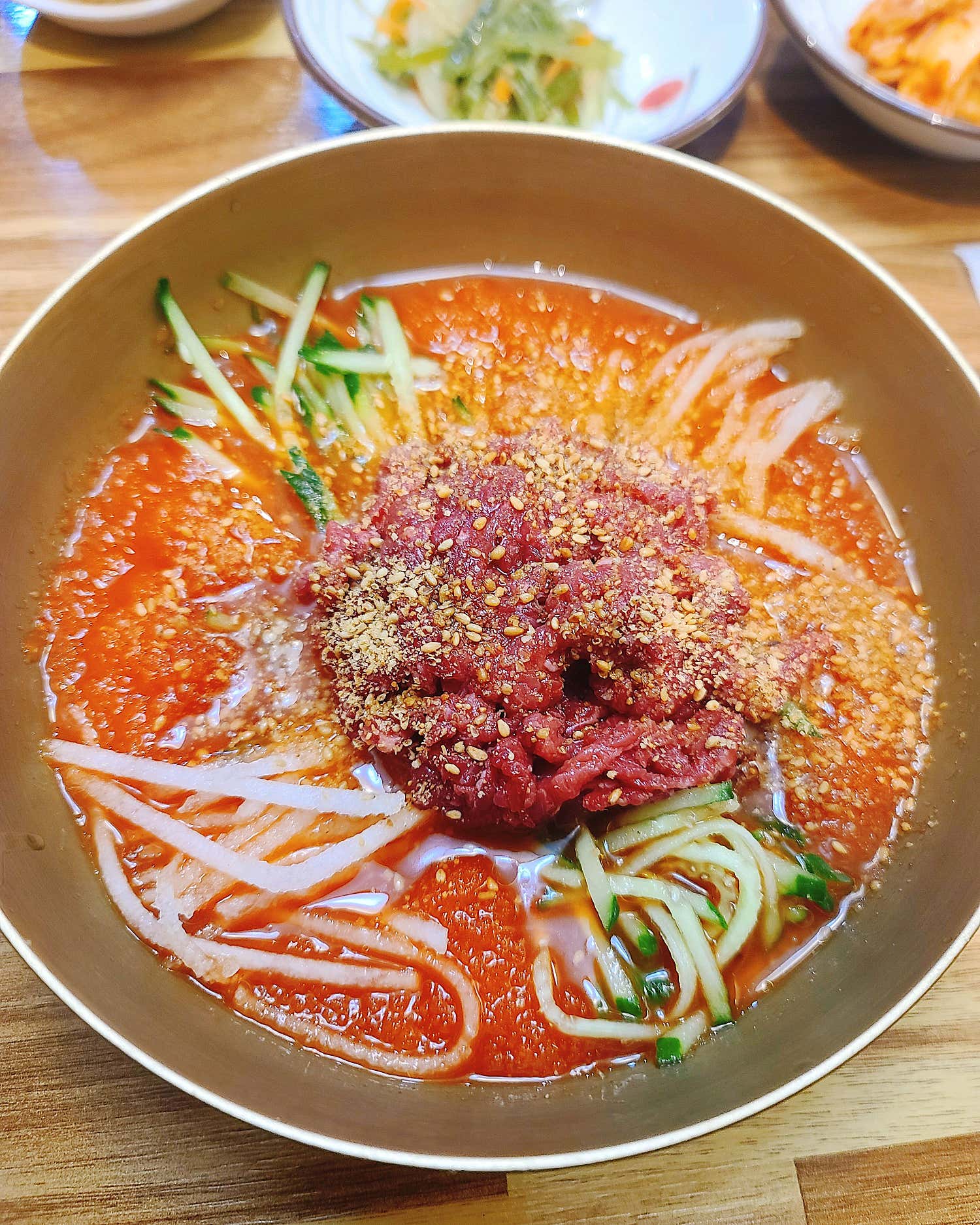 드디어 마주한 함양집의 시그니처, 한우물회입니다. 처음 먹어본다는 친구들도 있었지만, 한 숟가락 맛보는 순간 모두의 눈이 휘둥그레졌죠. 얼음 동동 띄워진 시원하고 매콤한 육수 위로 신선함이 극에 달한 육회가 소복하게 올라앉아 보기만 해도 침샘을 자극합니다. 그 어떤 미사여구로도 다 표현할 수 없는 이 맛!