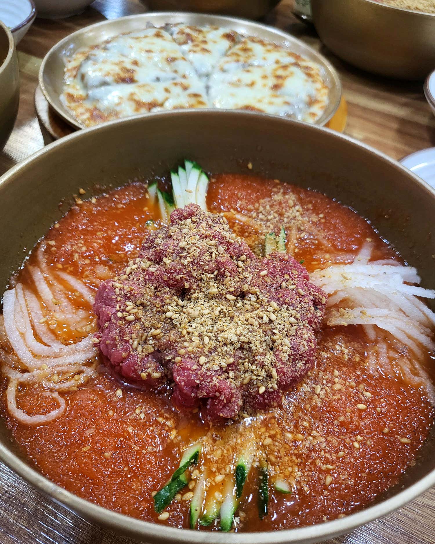 함양집의 치즈 떡갈비는 슴슴하니 간이 세지 않아 한우물회와 함께 먹을 때 그 진가를 발휘합니다. 매콤한 물회 한 입, 부드러운 떡갈비 한 조각의 조화는 그야말로 환상 궁합! 이 두 가지 메뉴를 동시에 맛보는 순간, 왜 함양집이 경주 맛집으로 끊임없이 회자되는지 고개를 끄덕이게 될 것입니다. 육회와 떡갈비, 이들의 완벽한 케미는 젓가락을 멈출 수 없게 만들죠.