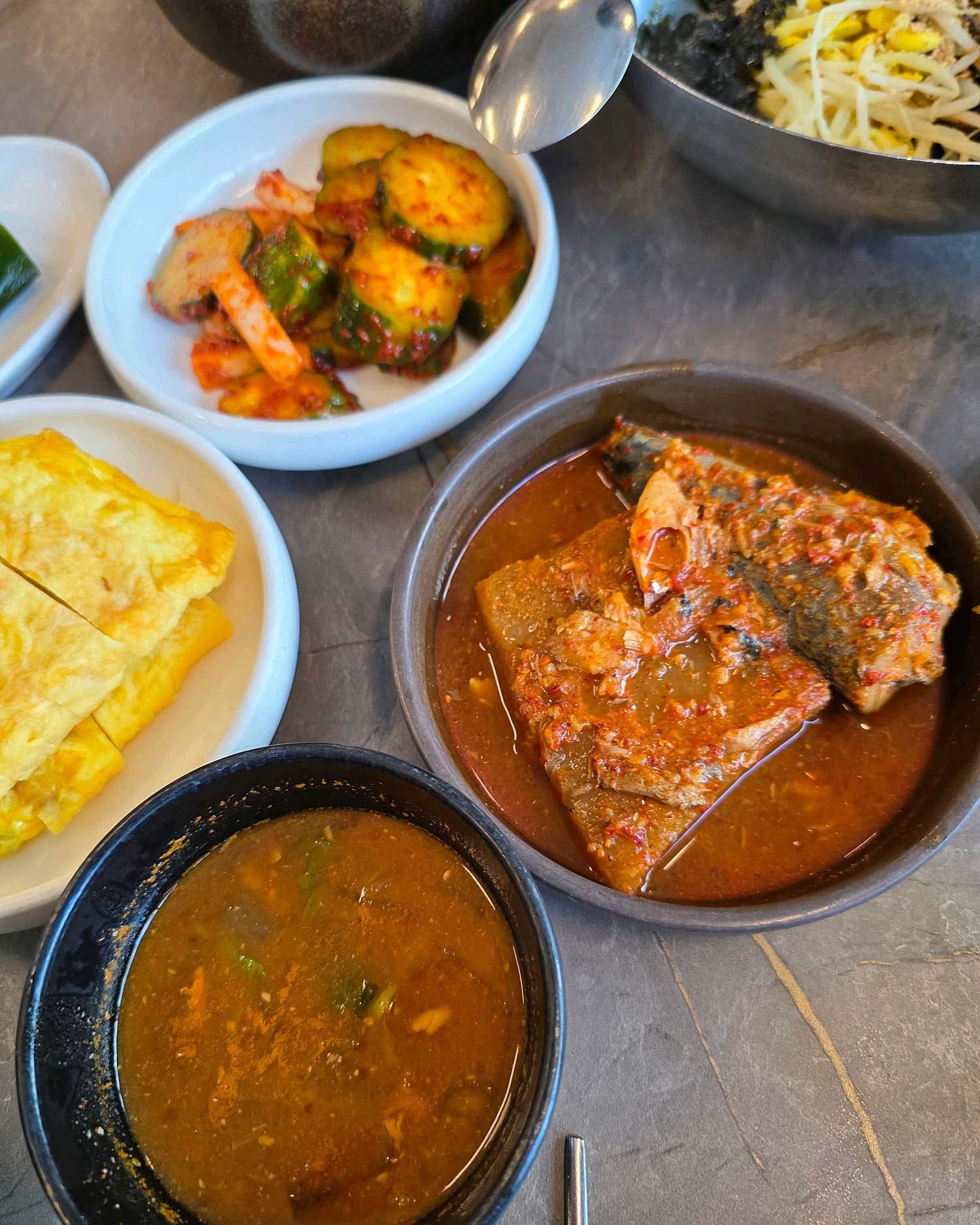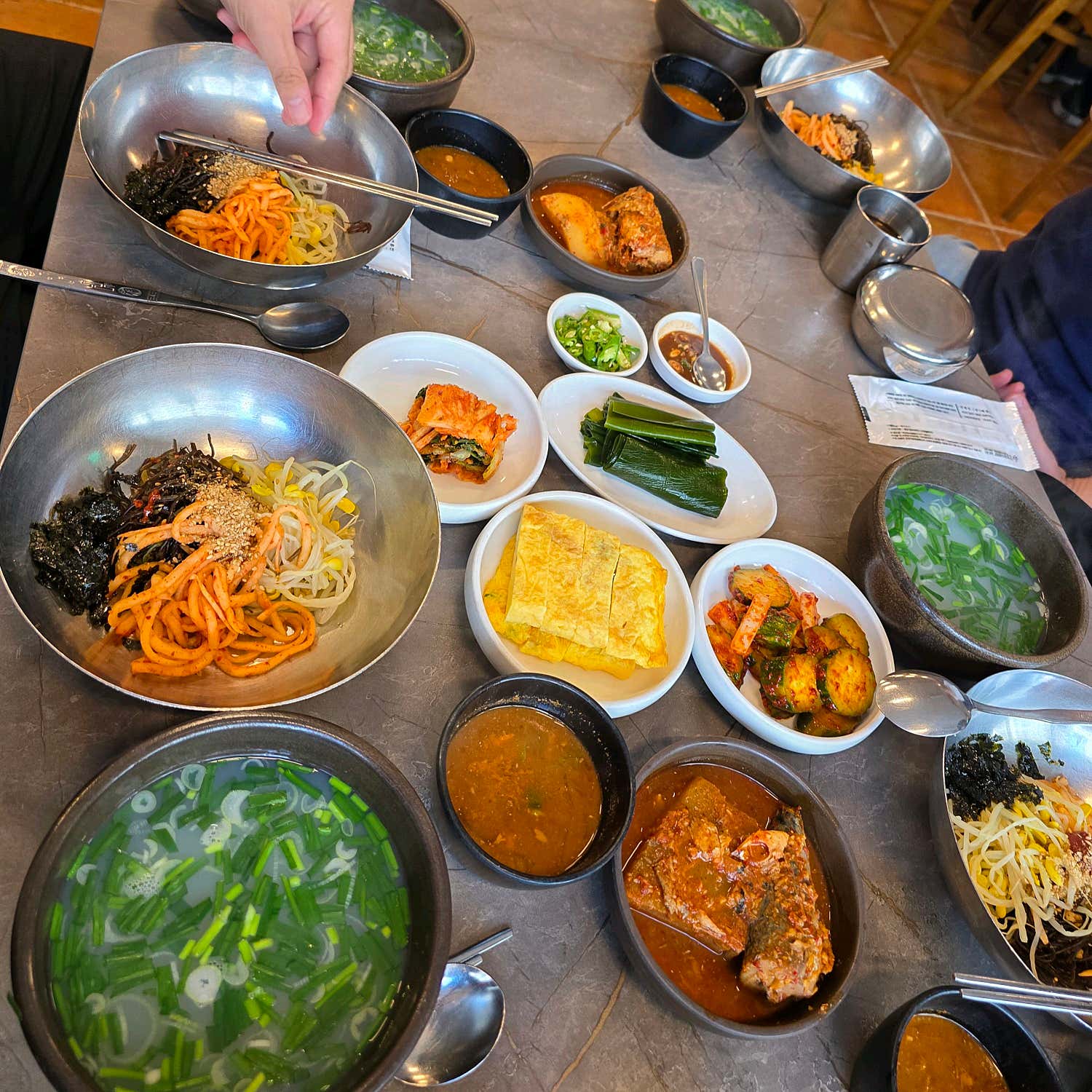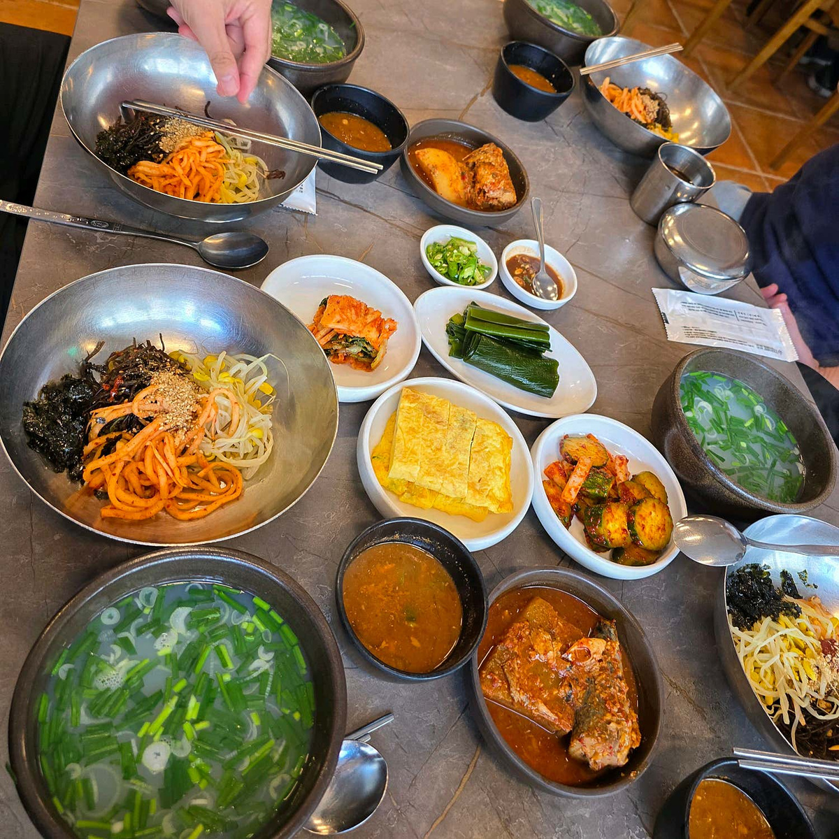 단돈 12,000원에 이렇게 건강하고 푸짐한 밥상을 만날 수 있다는 사실에 놀라움을 금치 못했습니다. 광안리 재첩정식은 맑은 재첩국을 기본으로, 다채로운 밑반찬들이 함께 나옵니다. 많지는 않지만, 하나하나 정성이 느껴지는 구성으로 메인 메뉴의 맛을 더욱 풍성하게 만들어주죠. 고소하게 구워진 생선구이, 폭신한 계란말이, 아삭한 김치, 그리고 쌈으로 즐길 수 있는 다시마까지. 이 모든 반찬들이 재첩국과 어우러져 완벽한 한 끼 식사를 완성합니다. 특히, 다시마에 밥과 재첩을 올려 쌈으로 즐기는 맛은 별미 중의 별미! 다양한 방식으로 재첩의 매력을 느낄 수 있는 것이 바로 정식의 큰 장점입니다.