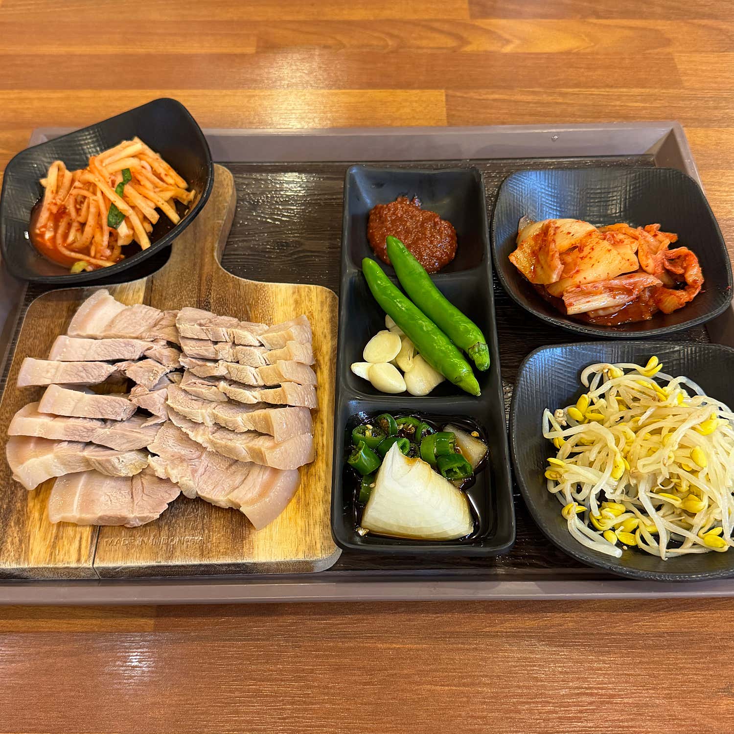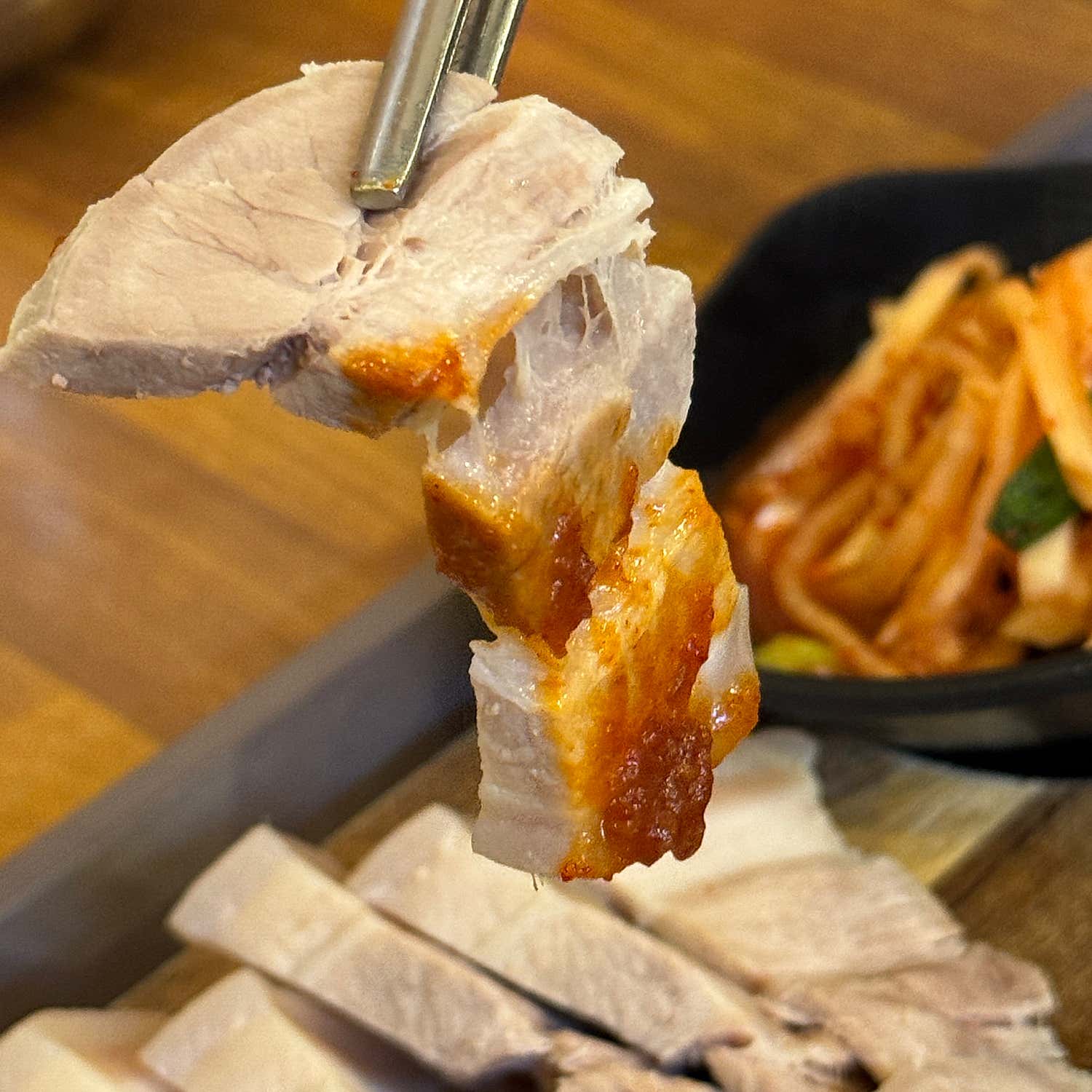 SET A 구성에 포함된 수육(돔베고기)은 그 자체로도 훌륭한 요리입니다. 한 점 집어 입에 넣는 순간, 잡내 없이 깔끔하고 부드러운 고기 맛이 입안 가득 퍼집니다. 윤기 흐르는 고기는 촉촉함을 머금고 있어 씹는 즐거움을 더하죠.