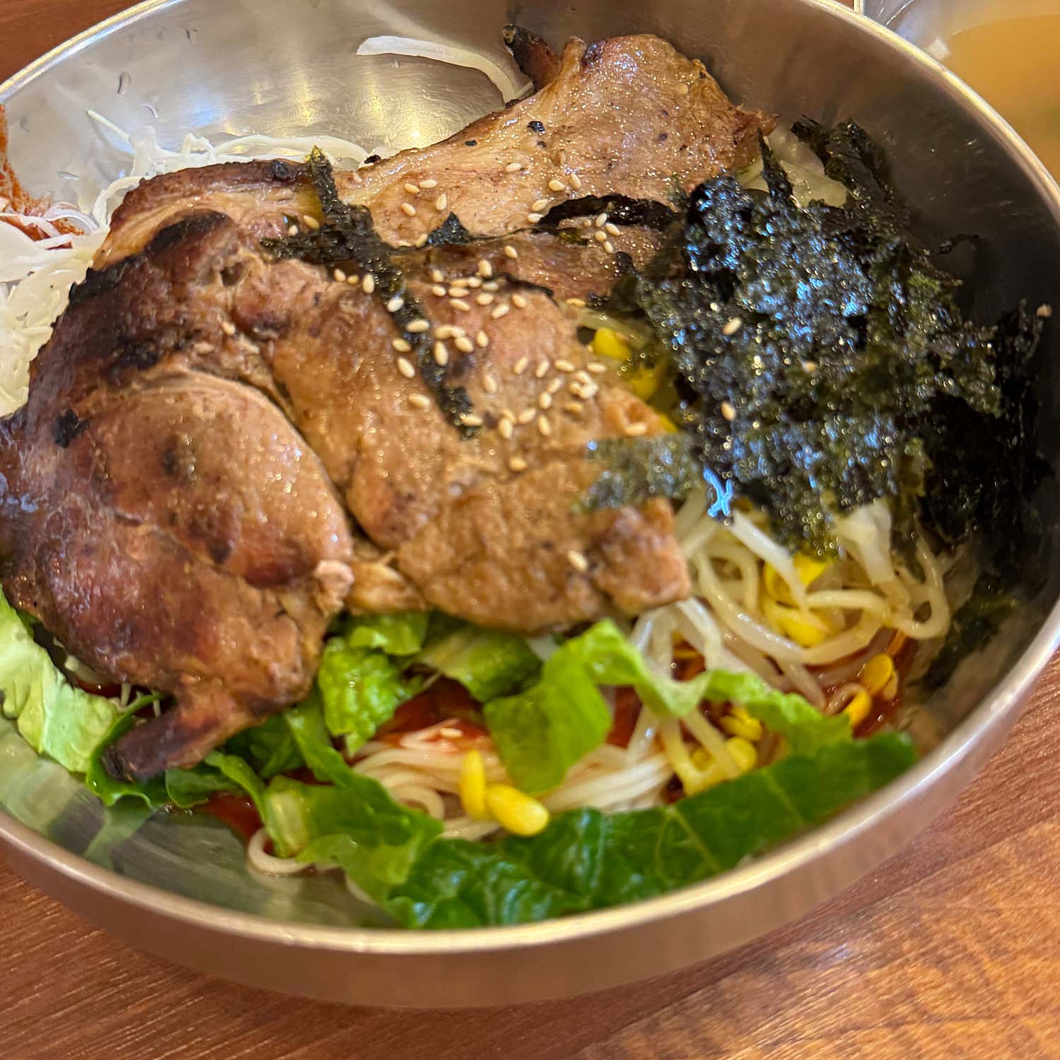 향긋한 훈연 향이 입맛을 돋우고, 적당히 매콤하면서도 고소한 양념은 쫄깃한 면발과 완벽하게 어우러집니다. 비빔국수 역시 양이 푸짐해서 한 그릇만으로도 든든함을 느낄 수 있어요. 고기국수와 비빔국수를 번갈아 먹으면 뜨거움과 시원함, 담백함과 매콤함이 절묘하게 조화되어 물릴 틈 없이 마지막 한 젓가락까지 맛있게 즐길 수 있답니다. 고기국수의 진한 맛이 부담스러울 때, 비빔국수의 상큼한 매콤함이 입안을 개운하게 해주는 별미 중의 별미였습니다.