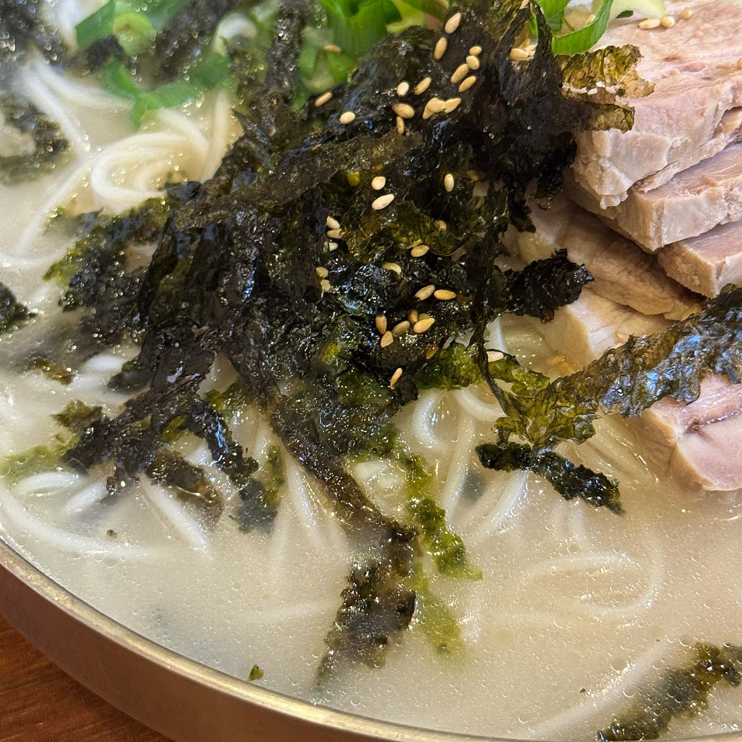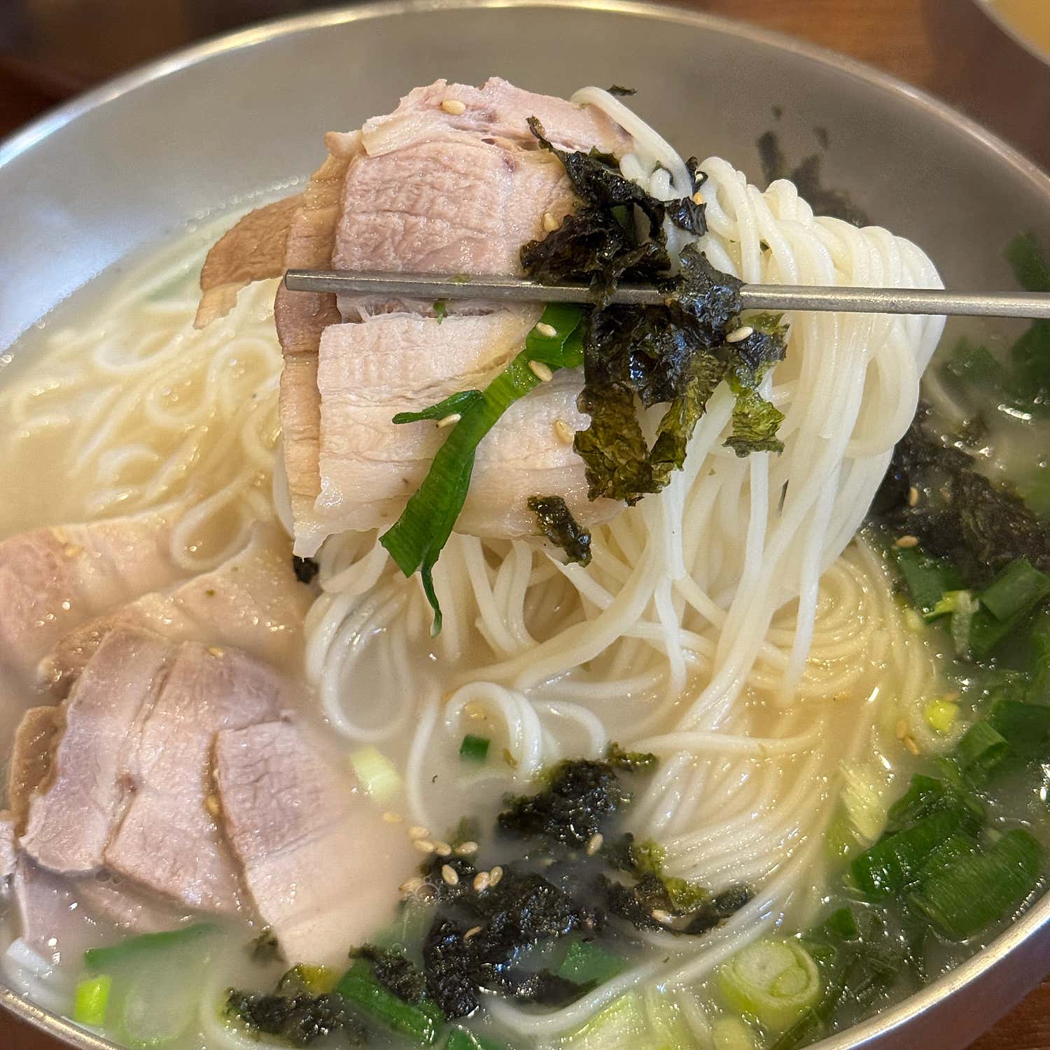 세물국수의 고기국수는 한 입 맛보는 순간, “제주 고기국수 원탑”이라는 찬사가 절로 나옵니다. 뽀얗고 녹진한 육수는 돼지 잡내 없이 깊고 담백하며, 입안을 부드럽게 감싸는 그 진한 고소함은 오래도록 여운을 남깁니다. 마치 진한 사골국물을 마시는 듯한 풍미랄까요? 이 육수가 얼마나 일품이던지, 끊임없이 떠먹게 되는 마성의 매력이 있어요. 게다가 육수 리필까지 가능하니, 배 터지게 먹을 준비 단단히 하셔야 합니다!