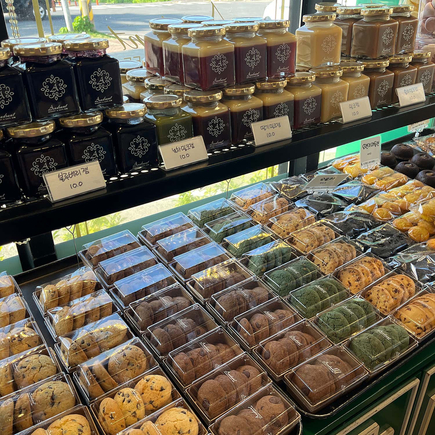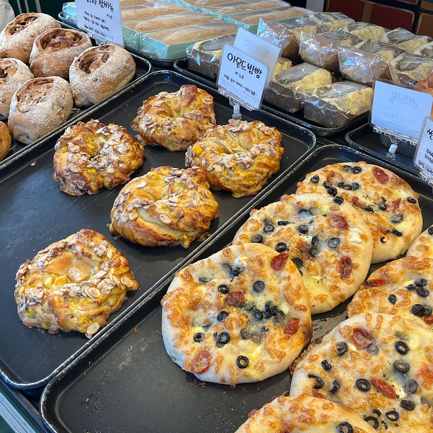 가게 안으로 들어서는 순간, 갓 구운 빵 냄새가 코끝을 간지럽히며 온몸의 미식 세포를 깨웁니다. 따뜻하고 아늑한 조명 아래, 빼곡히 진열된 영롱한 빛깔의 빵들이 마치 보석처럼 빛나고 있었어요. 빵 진열대마다 다양한 종류의 빵들이 가지런히 놓여 있었는데, 뭘 골라야 할지 행복한 고민에 빠지게 만들었답니다. 깔끔하면서도 정돈된 인테리어는 빵을 고르는 내내 기분 좋은 설렘을 선사했습니다.