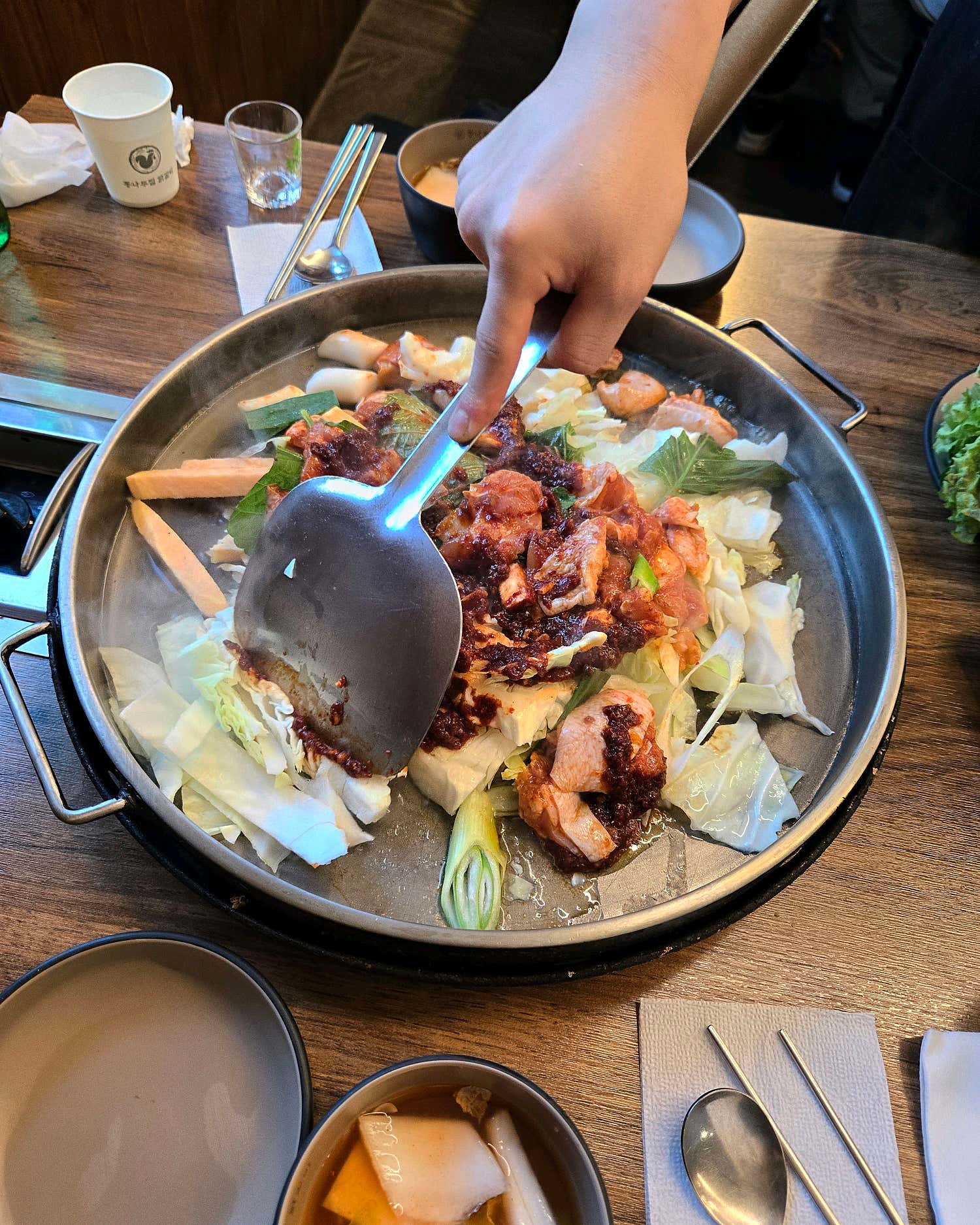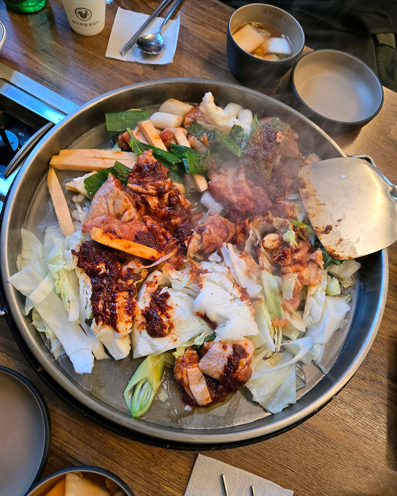직원분들이 능숙한 솜씨로 불 조절과 굽는 타이밍을 완벽하게 챙겨주셔서, 저희는 그저 익어가는 닭갈비의 아름다운 변화를 감상하며 편안하게 기다리기만 하면 됩니다. 철판 위에서 지글지글 익어가는 소리, 매콤달콤한 양념이 베인 닭고기와 채소의 환상적인 향기가 온 식당을 가득 채웁니다. 이 순간만큼은 세상의 모든 근심 걱정이 사라지는 듯한 기분이죠.