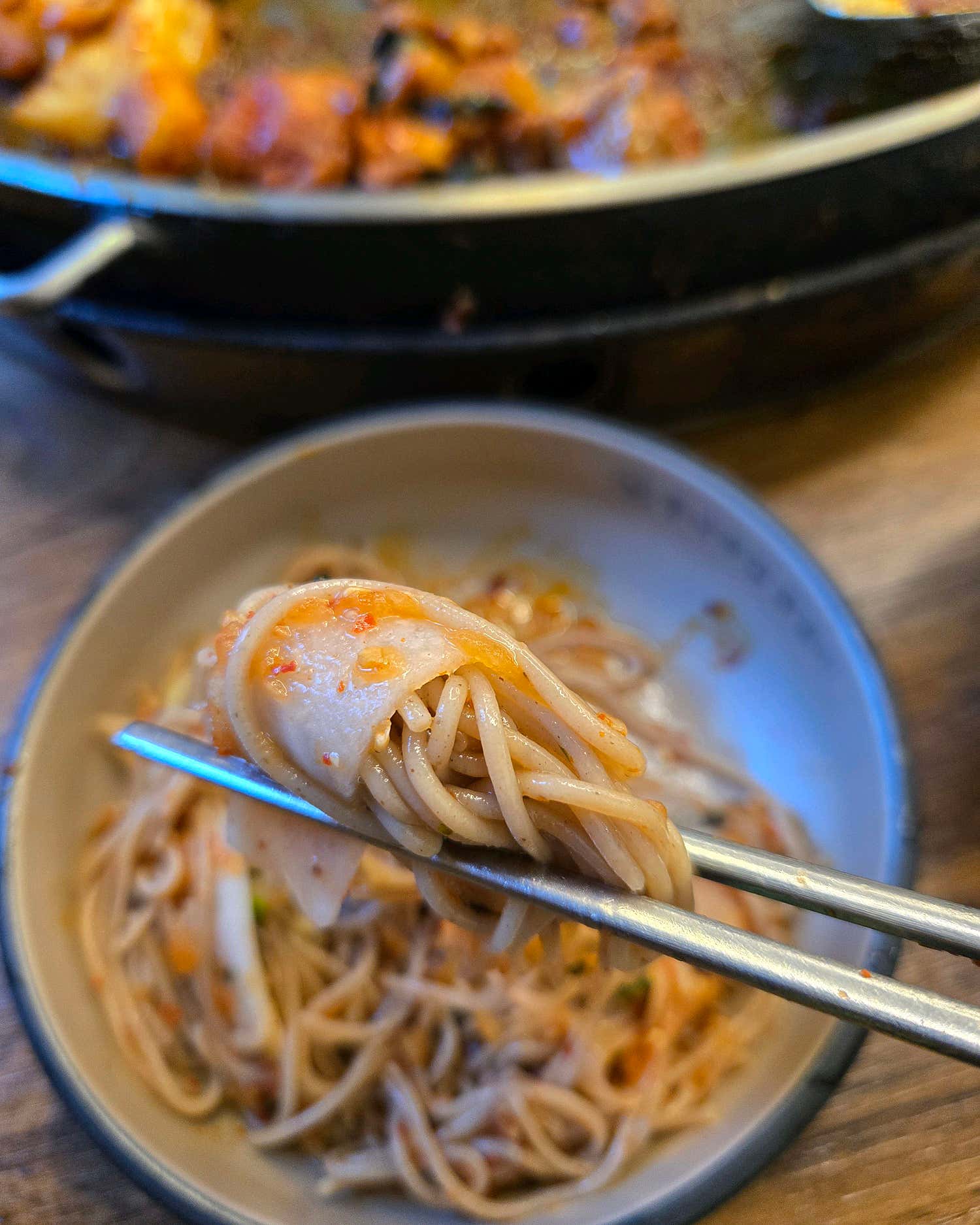 여기에 쫄깃한 **우동사리**는 필수 추가 메뉴입니다! 양념이 잘 배어든 우동사리를 호로록 먹으면, 입안 가득 퍼지는 감칠맛에 행복감이 절로 샘솟습니다. 아삭한 양배추와 달콤한 고구마는 식감의 재미를 더해주어, 마지막 한 점까지 물리지 않고 즐길 수 있도록 도와줍니다. 이 모든 재료들이 철판 위에서 만들어내는 하모니는 춘천 닭갈비의 정수라고 할 수 있었습니다.