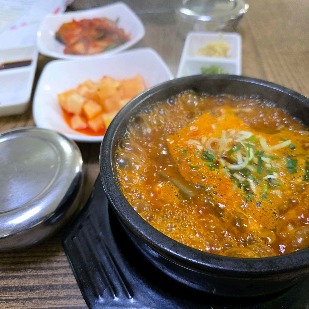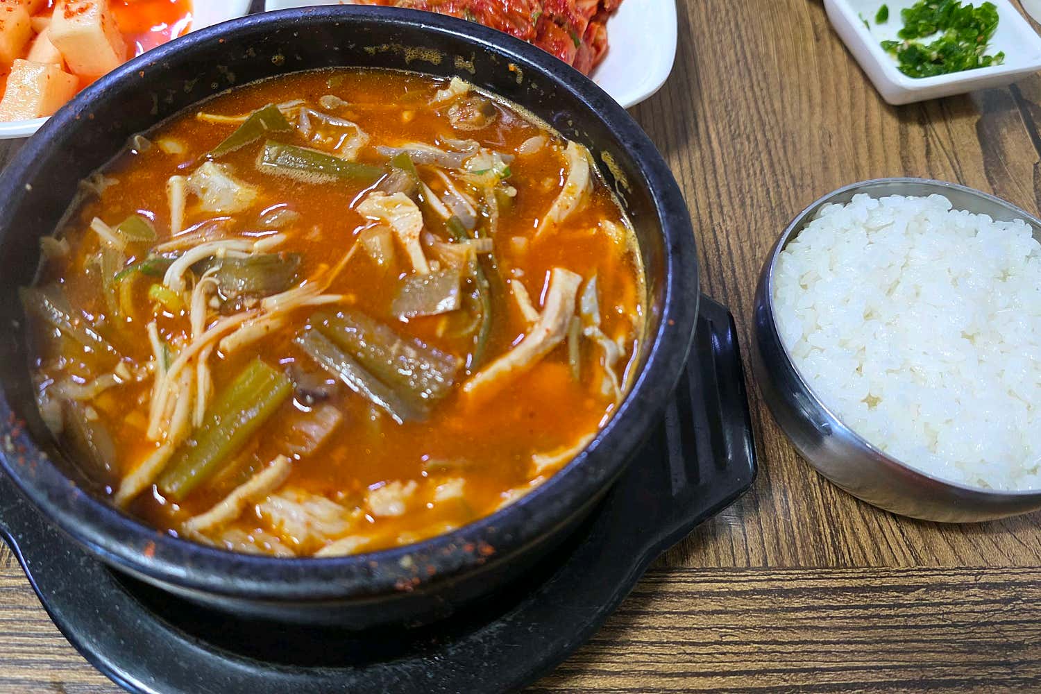 굴다리식당의 소내장탕은 한 숟가락 뜨는 순간, 왜 이곳이 상주의 ‘로컬 맛집’으로 불리는지 단번에 알 수 있게 합니다. 끓어오르는 뚝배기에서 피어오르는 김 사이로, 붉은빛 육수가 시선을 사로잡습니다.