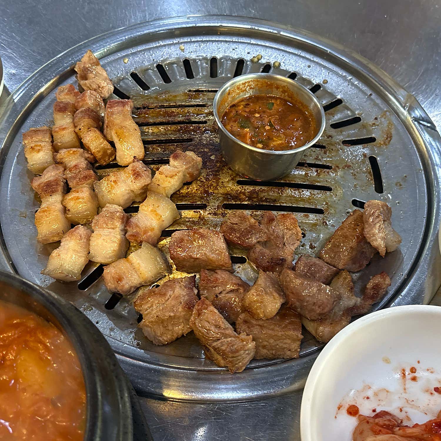 두툼하게 썰린 고기는 불판 위에서 지글지글 익어가며 고소한 불향을 한껏 뿜어냅니다.