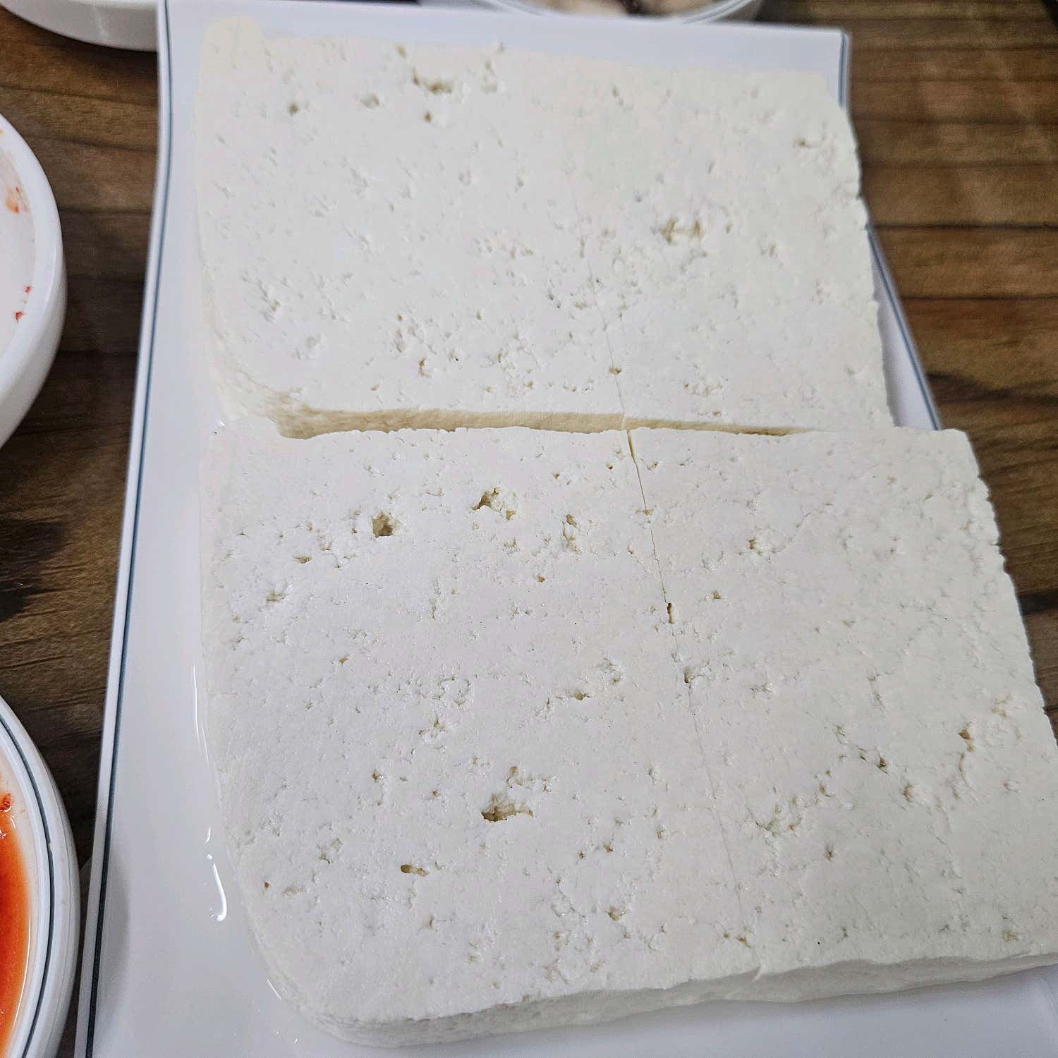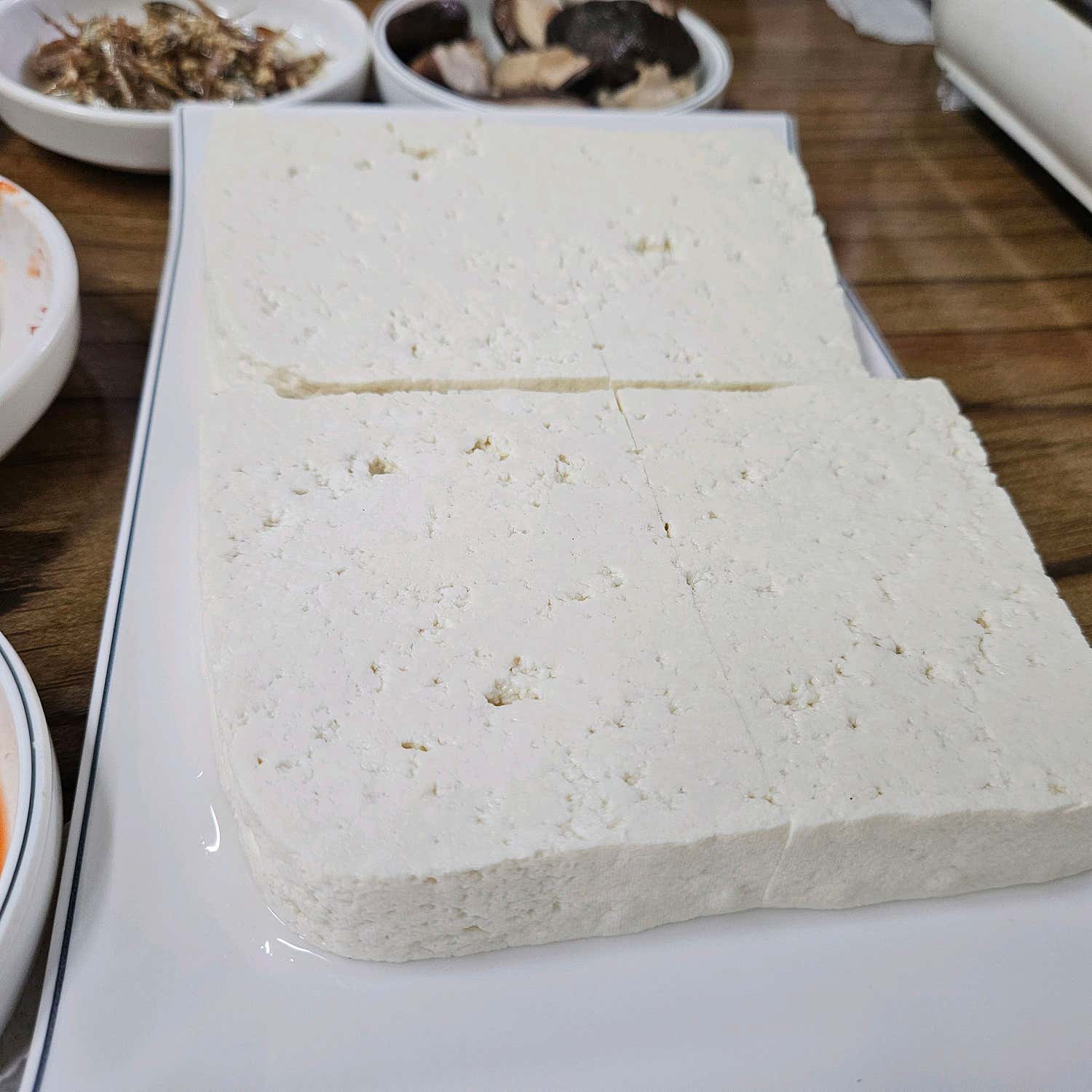 메인 메뉴만으로도 충분히 황홀하지만, 들기름에 구운 두부구이 역시 놓칠 수 없는 별미입니다. 큼직한 두부 4덩어리가 노릇하게 구워져 나오는데, 고소한 들기름 향이 코끝을 스치고, 겉은 바삭 속은 촉촉한 두부의 식감이 환상적입니다. 이 또한 사장님의 손맛이 만들어낸 예술 작품이라고 할 수 있죠.