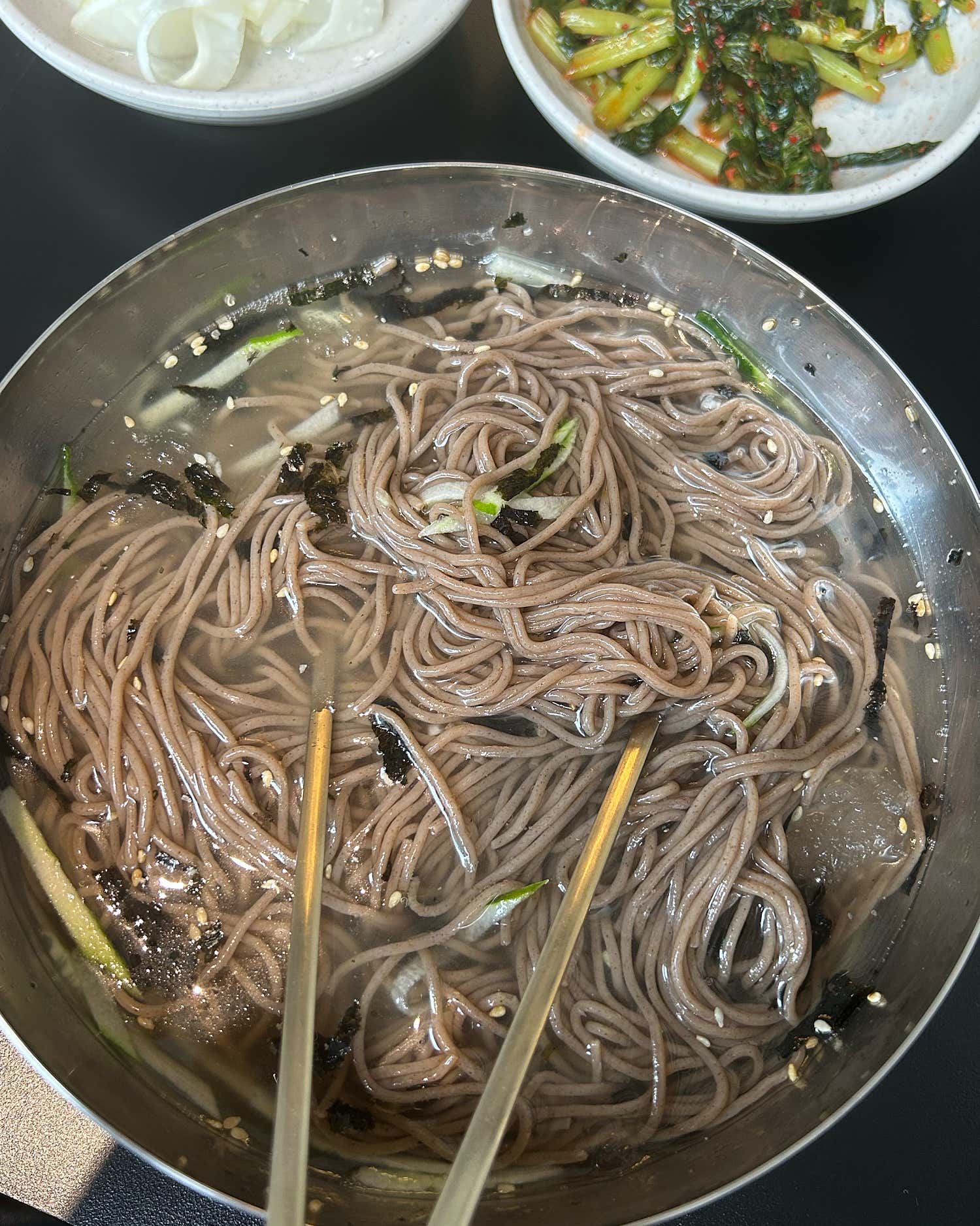 메밀전병과 함께 기본으로 제공되는 깔끔한 밑반찬들도 막국수의 맛을 더욱 풍성하게 만들어줍니다.