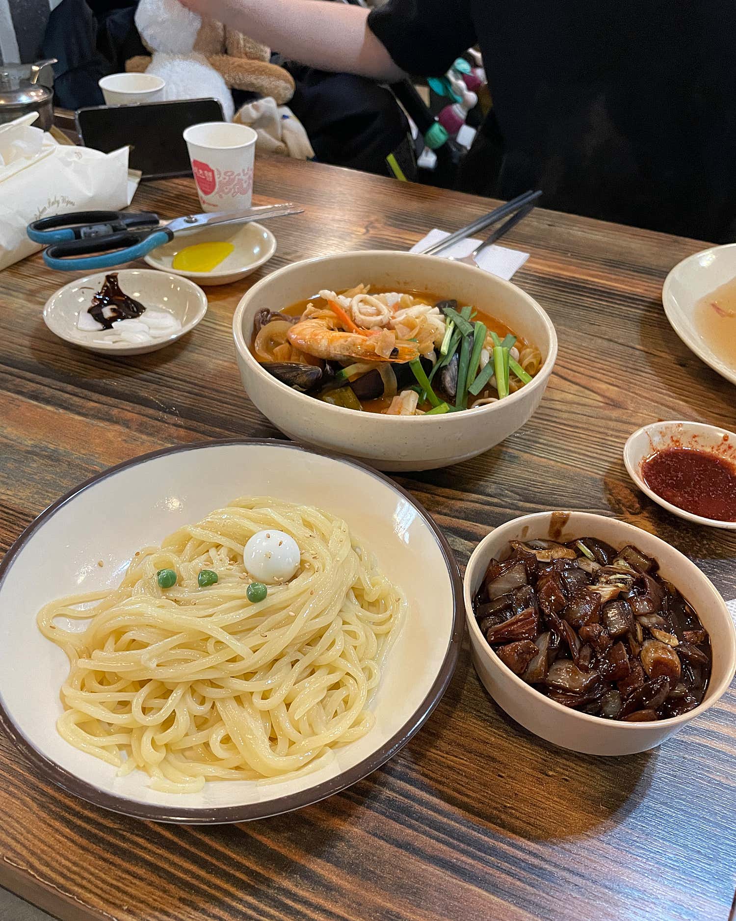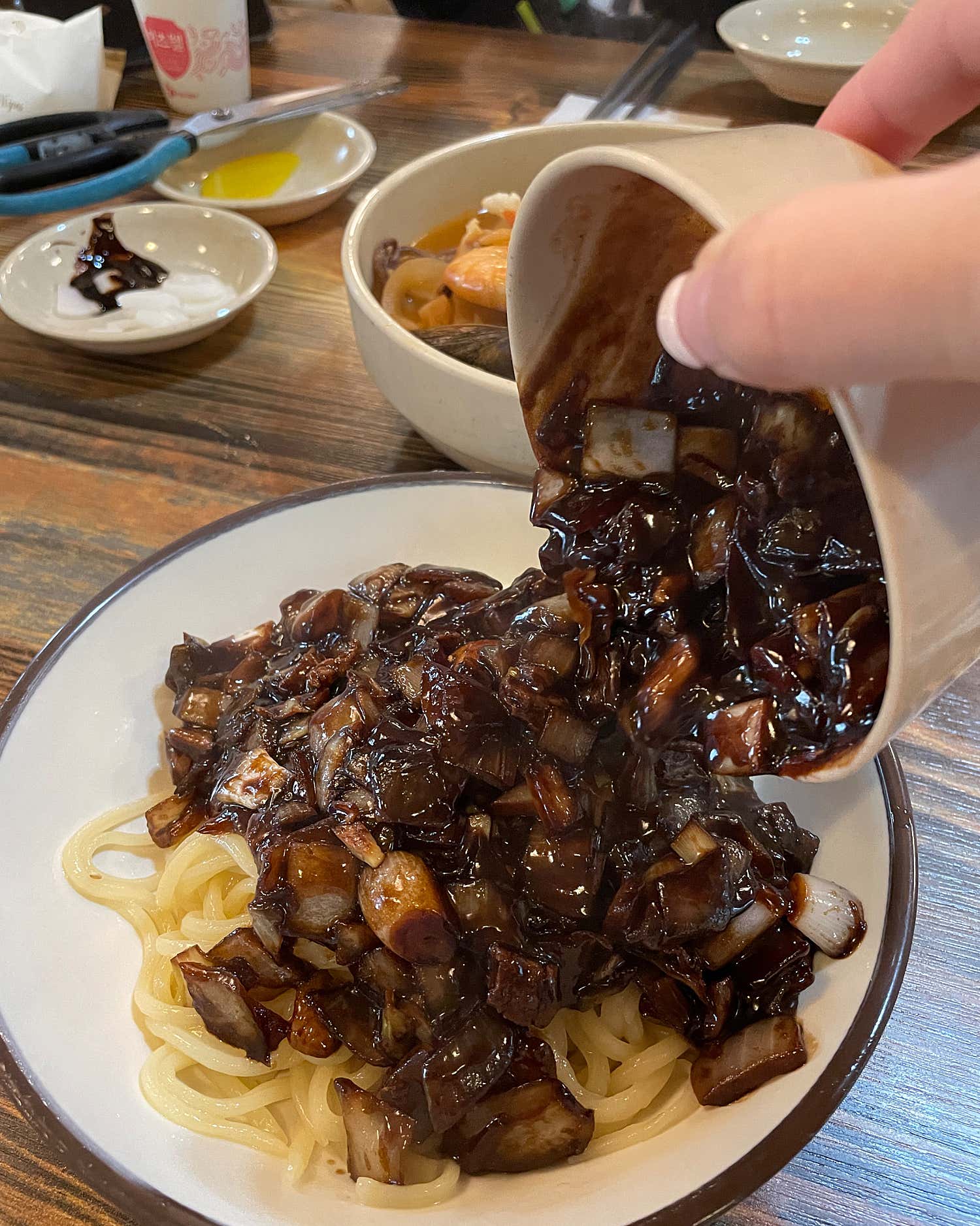 수많은 블로그에서 극찬했던 청산짜장의 쟁반짜장은 그 명성만큼이나 강력한 인상을 남겼습니다. 윤기 자르르 흐르는 검은 소스 위에 푸짐하게 올라간 해산물과 채소들이 시각적으로도 군침을 돌게 합니다. 면을 한입 맛보는 순간, 갓 뽑아낸 듯 쫄깃쫄깃 탱글한 면발이 입안을 가득 채우며 탄성을 자아냅니다. 면의 식감이 살아있어 씹는 재미가 확실했습니다.