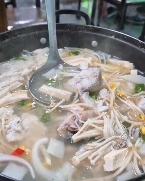 드디어 메인 메뉴! 저희는 생선조림을 주문했습니다. 불그스름한 양념이 먹음직스럽게 배어 있는 생선조림은 비주얼부터 군침을 돌게 만들었어요. 큼지막한 생선 살점과 부드럽게 익은 무가 어우러져 한 냄비 가득 푸짐하게 차려져 나옵니다.