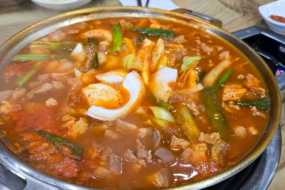 닭볶음탕의 여운이 가시기도 전에, 두 번째 메인 메뉴인 괴산 짜글이찌개가 등장했습니다. 보글보글 끓어오르는 새빨간 국물 위로 큼지막한 두부와 돼지고기, 그리고 각종 채소들이 푸짐하게 들어있어 보는 것만으로도 군침이 돌았어요. 특히 ‘골목길에 있는 짜글이 맛집’이라는 리뷰처럼, 우연히 발견한 보물 같은 맛에 감탄사를 연발했습니다.