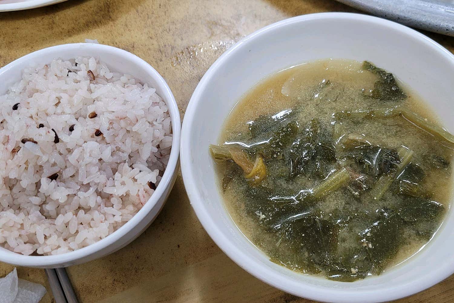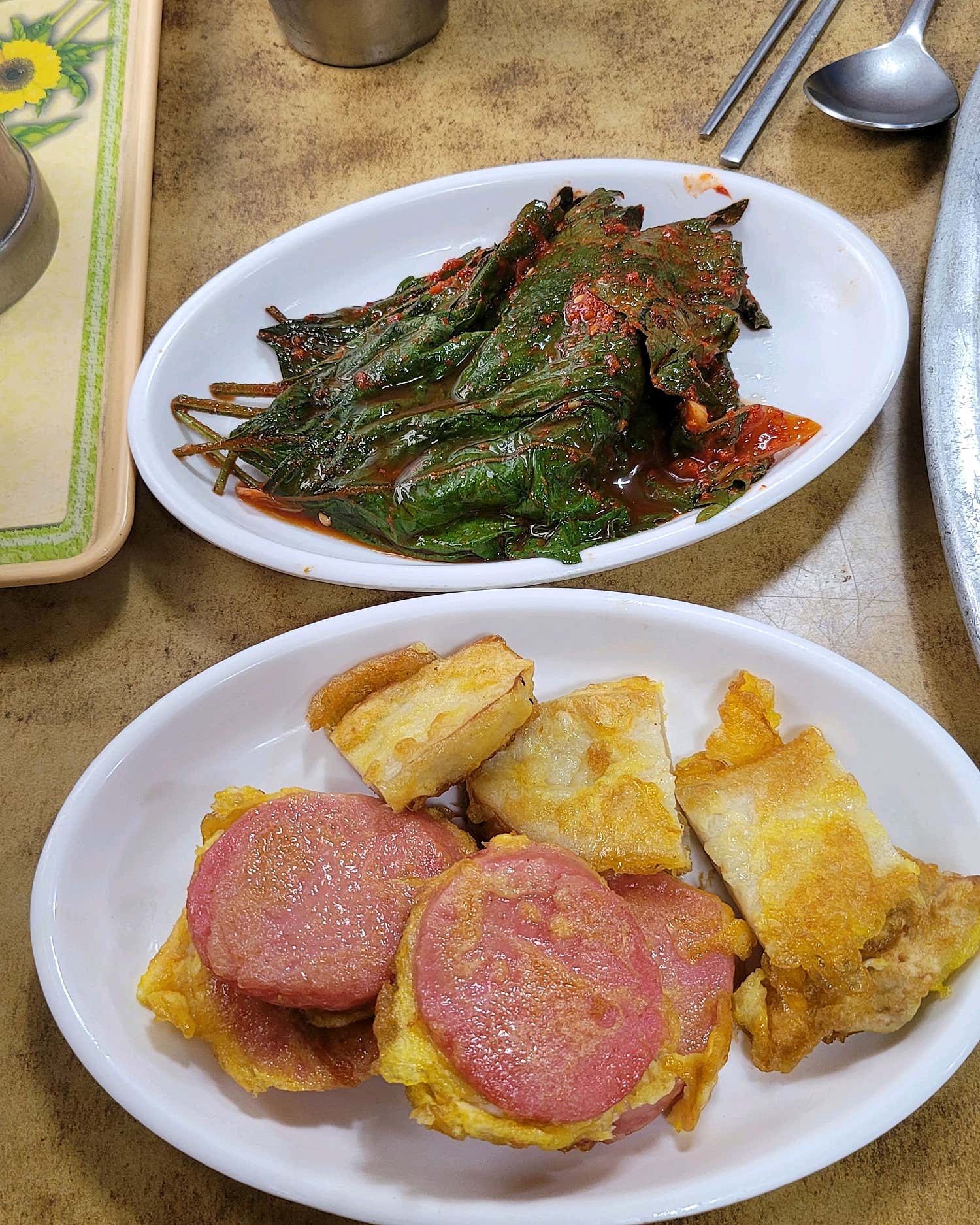 밥도둑으로 손색없는 갓김치와 배추김치는 시원하고 아삭한 맛으로 입맛을 돋우고, 부드러운 식감의 계란찜은 짭조름한 간장 양념과 만나 환상의 궁합을 자랑했습니다. 고소하게 부쳐낸 생선전은 겉은 바삭하고 속은 촉촉하여 자꾸만 손이 가는 매력이 있었죠.