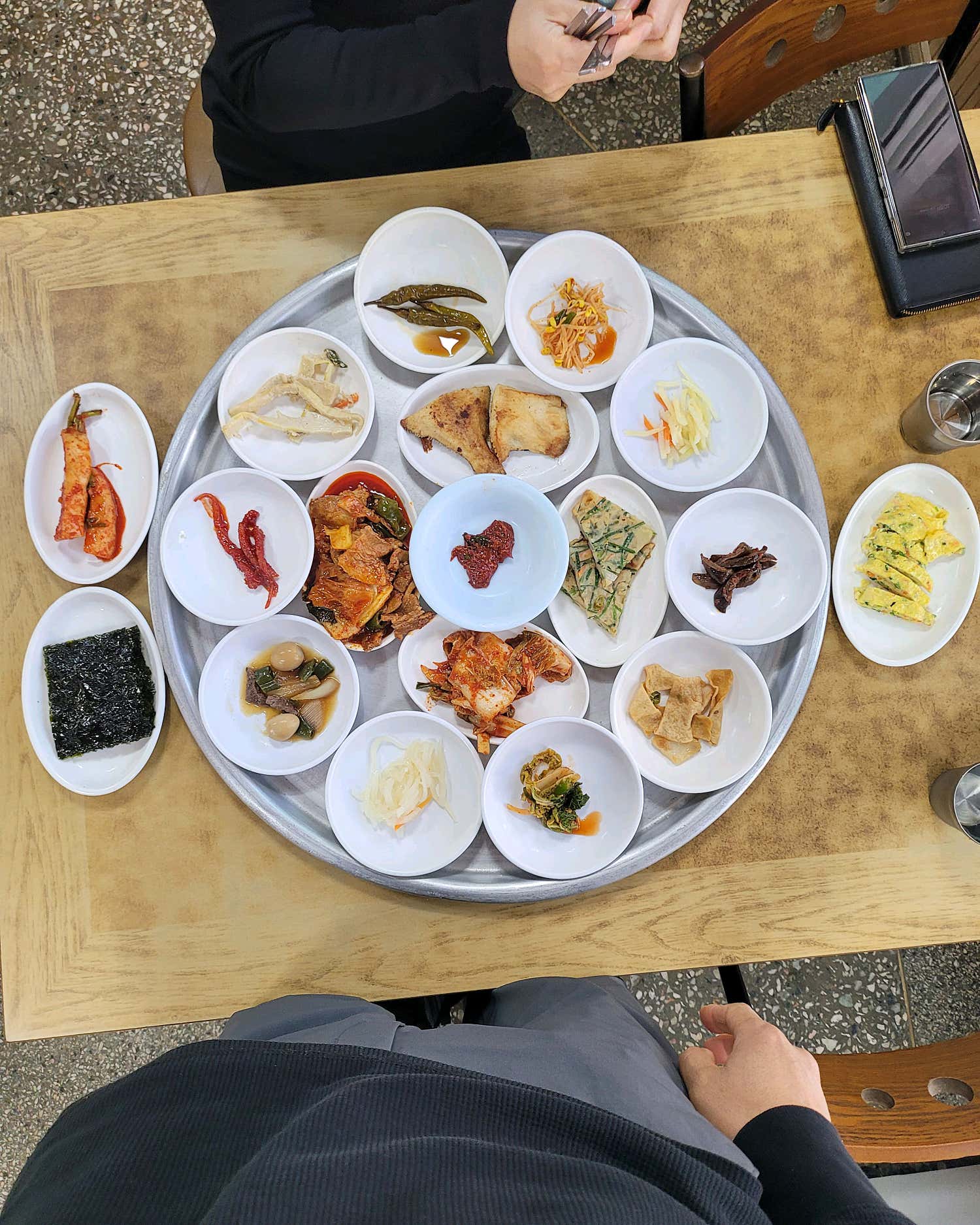 자, 이제 진도식당의 하이라이트인 19찬 백반을 이야기할 시간입니다. 주문과 동시에 차려지는 상차림을 보고 있자니, 저절로 감탄사가 터져 나옵니다. 믿을 수 없을 정도로 가짓수가 많은 반찬들이 테이블을 빈틈없이 빼곡하게 채우는데, 그야말로 오색찬란한 비주얼에 압도당하는 기분이었죠.