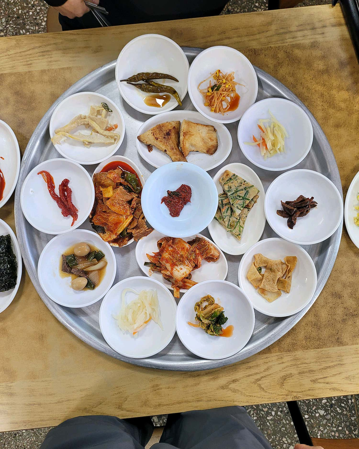 자, 이제 진도식당의 하이라이트인 19찬 백반을 이야기할 시간입니다. 주문과 동시에 차려지는 상차림을 보고 있자니, 저절로 감탄사가 터져 나옵니다. 믿을 수 없을 정도로 가짓수가 많은 반찬들이 테이블을 빈틈없이 빼곡하게 채우는데, 그야말로 오색찬란한 비주얼에 압도당하는 기분이었죠.