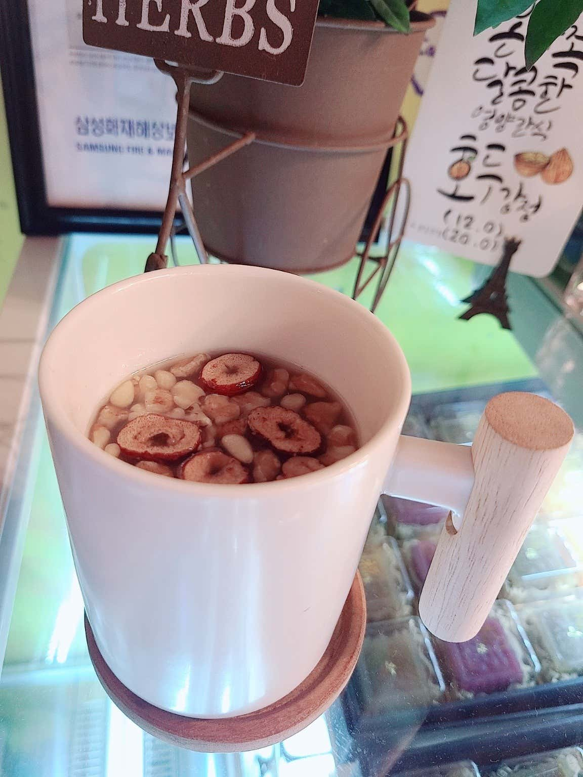 이곳의 쌍화차 역시 빼놓을 수 없는 별미입니다. 컵 가득 수북하게 올려진 대추, 잣, 호두 등 다양한 견과류는 시각적인 즐거움은 물론, 오독오독 씹히는 식감으로 차 마시는 재미를 더해줍니다. 한방차 특유의 쌉쌀한 맛과 견과류의 고소함이 완벽한 조화를 이루며, 한 잔만으로도 기력이 보충되는 듯한 에너지를 선사합니다. 이렇게 아낌없이 재료를 사용하는 사장님의 넉넉한 인심은 차 한 잔에 담긴 정성을 더욱 깊게 느끼게 합니다.