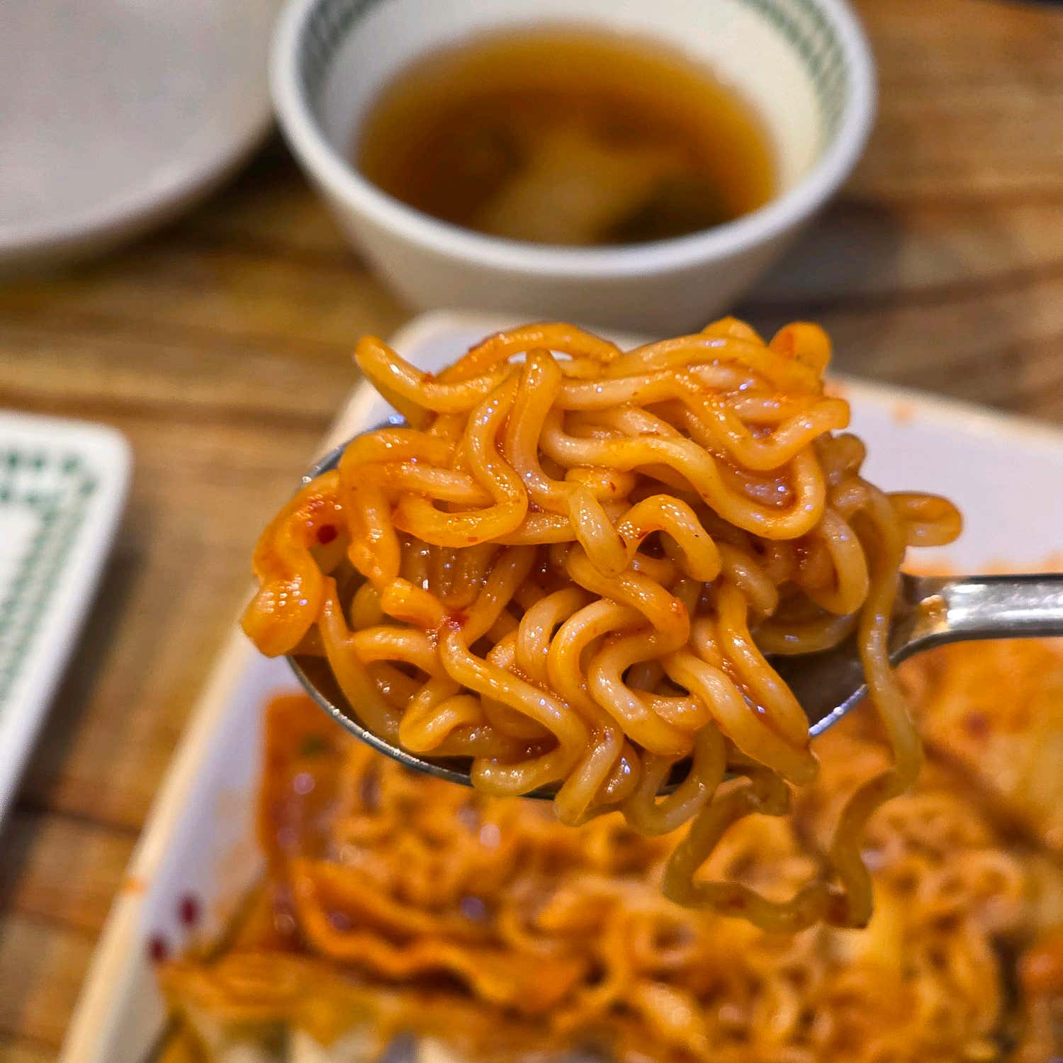 다음 타자는 바로 라볶이정식입니다. 메뉴 이름에 ‘정식’이라는 단어가 붙는 이유를 한눈에 알아볼 수 있을 정도로 압도적인 양과 다채로운 구성에 먼저 놀라게 됩니다. 새빨간 양념 속에서 윤기를 머금은 탄력 있는 면발은 소스를 한껏 머금고 있어, 입안에 넣는 순간 매콤달콤한 풍미가 폭발합니다. 맵지 않은 편이라 매운 음식을 잘 못 드시는 분들도 부담 없이 즐길 수 있는 맛입니다.
