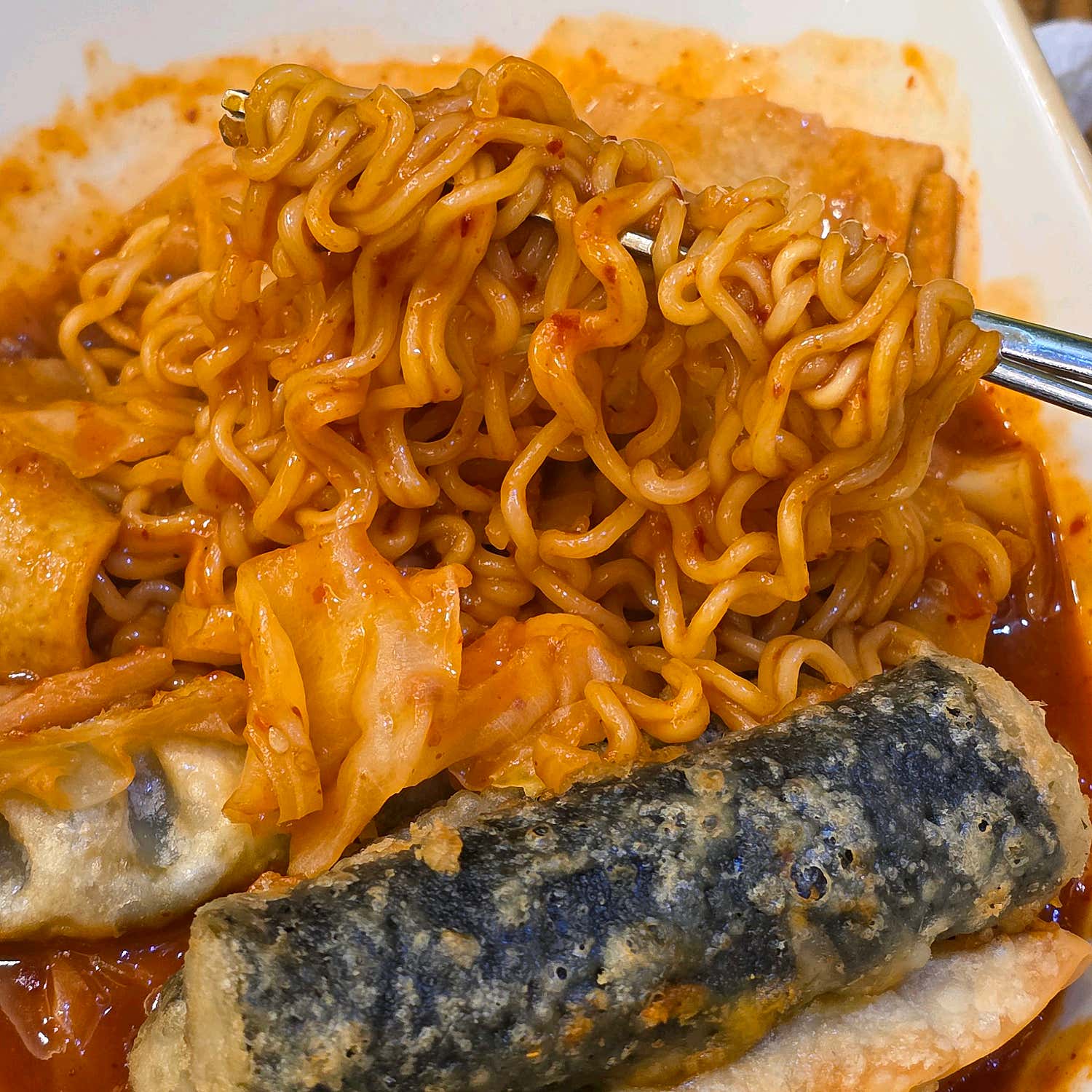 더욱 감탄스러운 점은 바로 ‘정식’이라는 이름에 걸맞은 푸짐한 토핑 구성입니다. 쫄깃한 만두, 바삭한 김말이, 쫀득한 치즈떡과 말랑한 밀떡까지, 다양한 식감의 향연이 펼쳐집니다. 어묵도 잔뜩 넣어주셔서 어느 것 하나 부족함 없이 풍성하게 즐길 수 있습니다. 날치알김밥 한 조각을 라볶이 소스에 푹 찍어 먹는 순간, 왜 이 조합이 동명김밥의 시그니처인지 깨닫게 되실 거예요. 정말 맛있어서 숟가락을 멈출 수가 없었습니다!