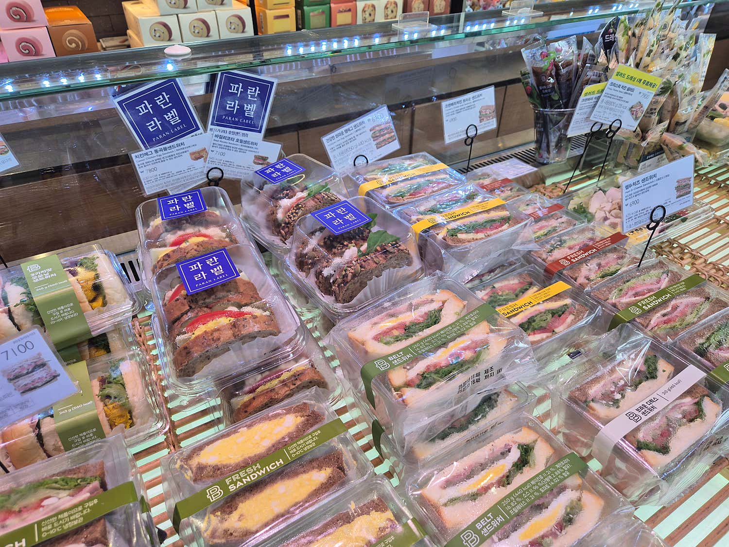 많은 분들이 “출근길에 샌드위치 사기 너무 좋다!”고 극찬하는 이유가 있었습니다. 실제로 오전 시간대에 방문하면 샐러드와 샌드위치 종류가 놀랍도록 다양하게 진열되어 있어요. 보기만 해도 싱그러운 채소와 신선한 재료들이 겹겹이 쌓여 마치 예술 작품 같았습니다.