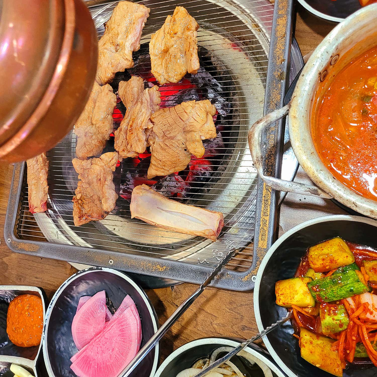 돼지갈비 또한 빼놓을 수 없는 별미입니다. 잘 재워진 돼지갈비를 불판 위에서 노릇노릇하게 구워 한 입 베어 무는 순간, 입안 가득 퍼지는 진한 육향과 쫄깃하면서도 부드러운 식감이 일품입니다. 양념 불고기와는 또 다른 매력으로, 고기 본연의 맛을 살리면서도 양념이 적절하게 배어들어 질리지 않는 맛을 선사합니다. 고기를 잘 못 굽는 ‘굽기 초보’분들도 걱정 마세요. 적당한 불 조절과 직원분들의 친절한 가이드로 누구나 맛있는 갈비를 즐길 수 있습니다.