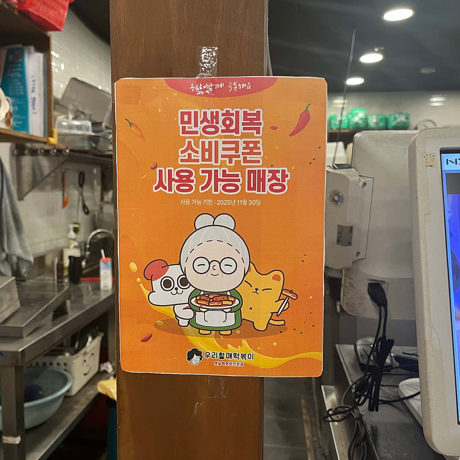 우리할매떡볶이 기흥점에 들어서는 순간, 마치 시간을 거슬러 올라간 듯한 정겨운 분위기가 저를 반겼습니다. 화려함보다는 깔끔하고 편안한 인테리어는 ‘초등학교 앞 분식집’의 아련한 향수를 불러일으키기에 충분했죠. 친구들과 삼삼오오 모여 앉아 왁자지껄 떡볶이를 먹던 그때 그 시절의 추억이 새록새록 떠올랐습니다. 매장 내부는 번잡하지 않으면서도 아늑한 느낌을 주어, 혼밥을 즐기기에도, 친구나 가족과 함께 담소를 나누며 식사하기에도 더할 나위 없이 좋았습니다.