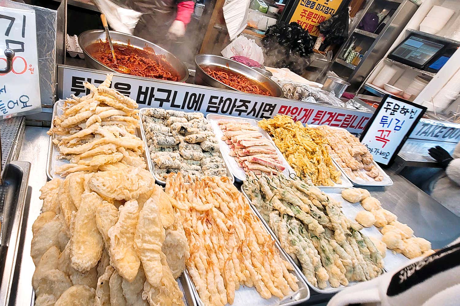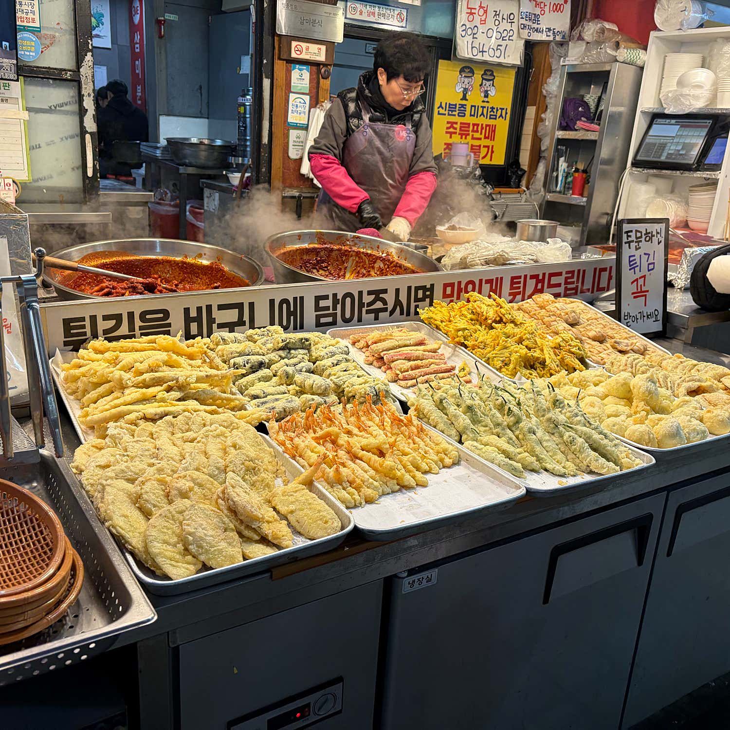매장 한쪽에는 신선한 재료들로 가득 채워진 분식 코너가 손님들을 유혹합니다. 방금 튀겨낸 듯 노릇노릇한 튀김들, 보기만 해도 먹음직스러운 순대와 김밥들이 진열되어 있어, 뭘 먹어야 할지 행복한 고민에 빠지게 만들죠.