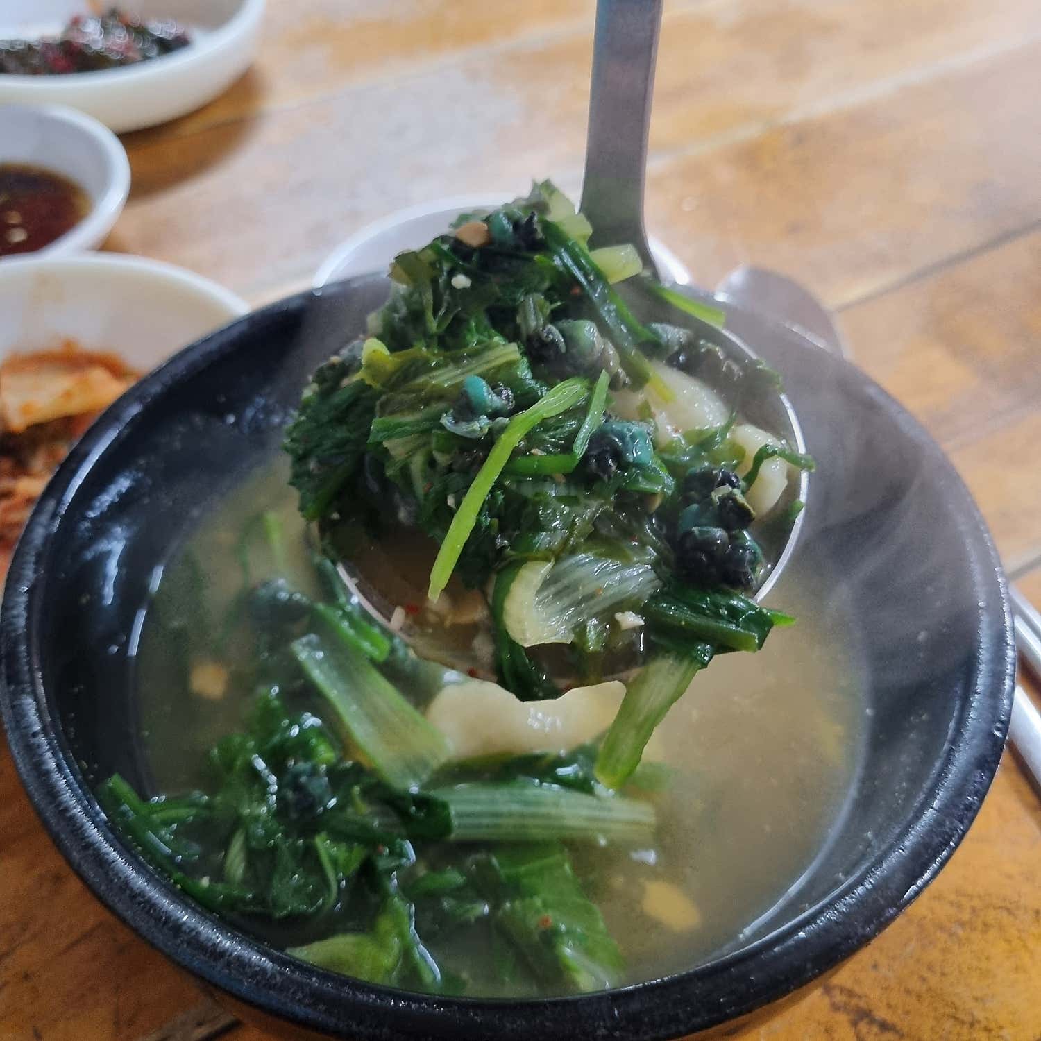 국밥 속에는 푸릇한 얼갈이배추와 수제비까지 들어있어 더욱 풍성한 맛과 식감을 선사합니다. 얼갈이배추는 국물에 부드럽게 어우러지면서도 살아있는 아삭함을 잃지 않아 개운함을 더해주고, 쫄깃한 수제비는 든든함을 한층 끌어올려 줍니다. 한 그릇 비우고 나면 몸이 개운해지고 에너지가 솟아나는 기분, 바로 이런 게 진정한 향토음식의 힘이 아닐까요?
