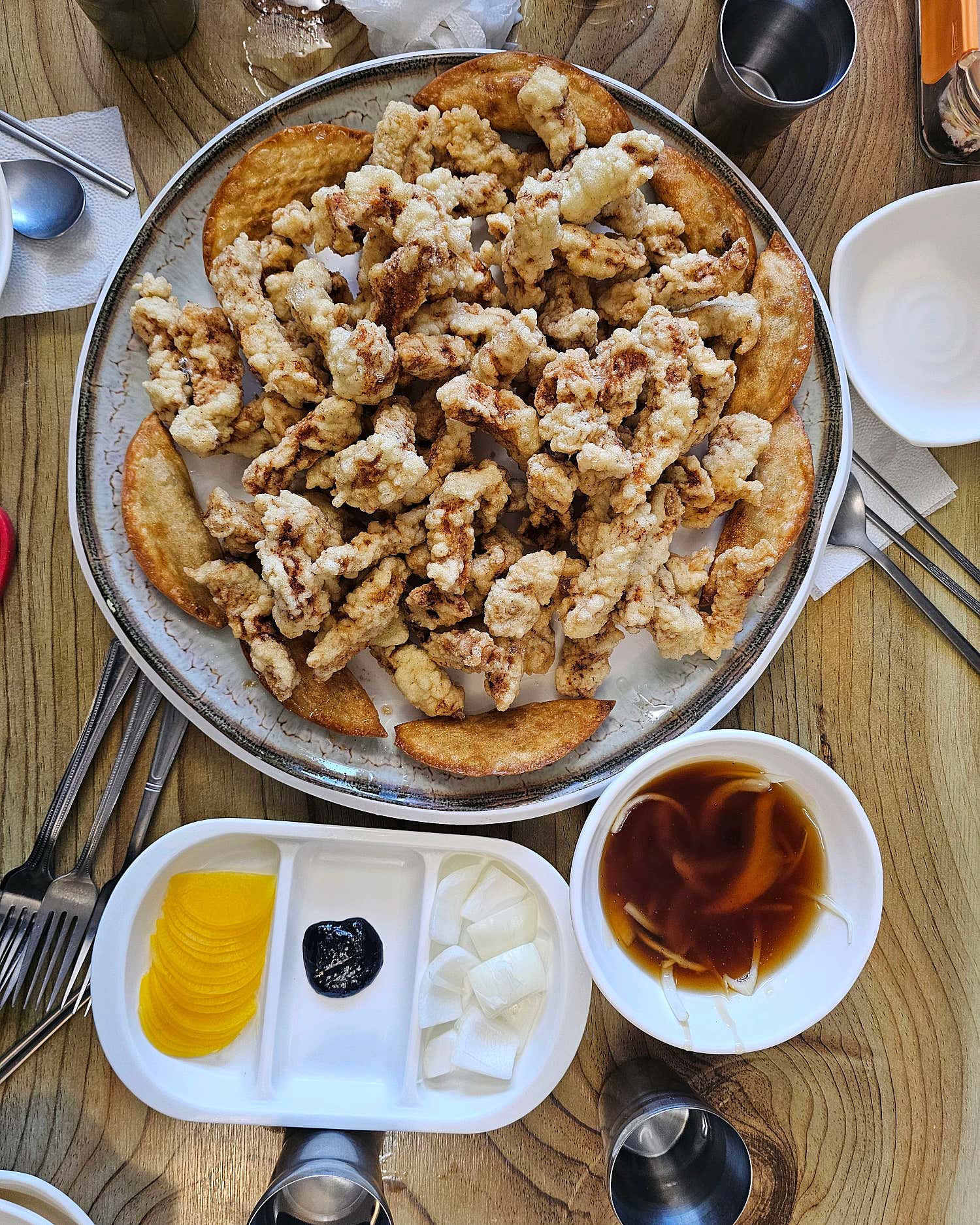 유니짜장과 더불어 덕승관의 양대 산맥으로 불리는 탕수육 또한 절대 빼놓을 수 없는 별미입니다. 황금빛 바삭함을 자랑하는 튀김옷은 마치 솜사탕처럼 사르르 녹아내리면서도, 그 속을 꽉 채운 두툼한 국내산 돼지고기는 육즙을 가득 머금어 입안에서 팡하고 터지는 듯한 경험을 선사합니다. 고기 냄새는 전혀 찾아볼 수 없으며, 얇은 튀김옷과 부드러운 고기의 조화는 그야말로 예술이었죠.