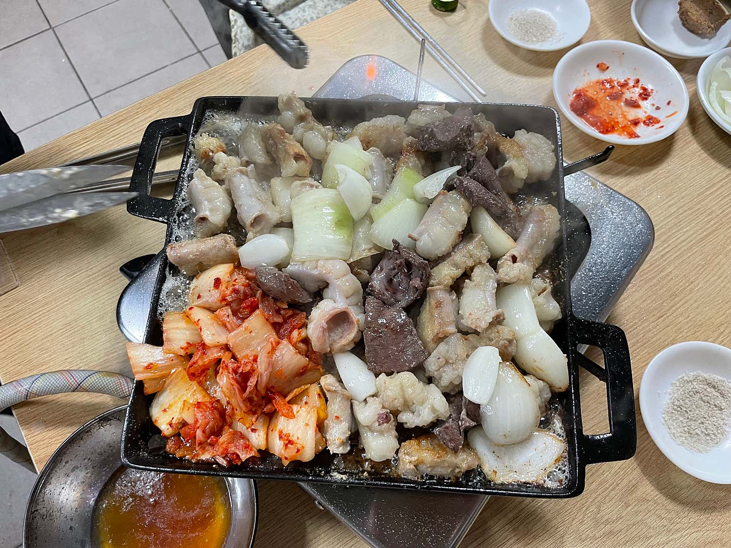 내부는 소박하지만 정겹습니다. 테이블마다 놓인 불판 위에서 곱창이 지글거리는 소리가 끊이지 않고, 은은하게 퍼지는 고소한 곱창 냄새는 들어서는 순간부터 식욕을 한껏 자극합니다. 북적이는 사람들 속에서 오가는 담소는 이곳이 단순한 식당을 넘어, 삶의 애환과 추억이 쌓이는 사랑방 같다는 인상을 줍니다. 화려한 인테리어보다는 맛으로 승부하는 찐 노포 맛집의 아우라가 공간 전체에 짙게 배어있죠.