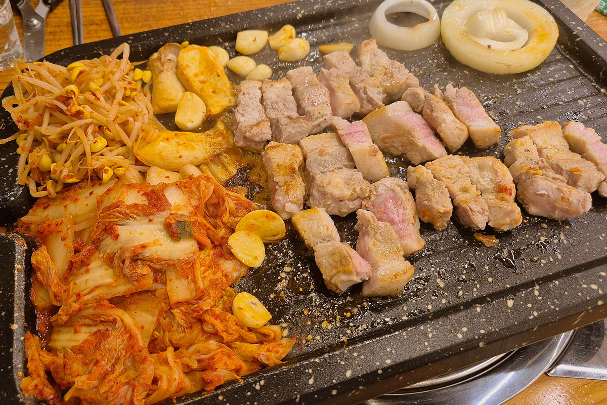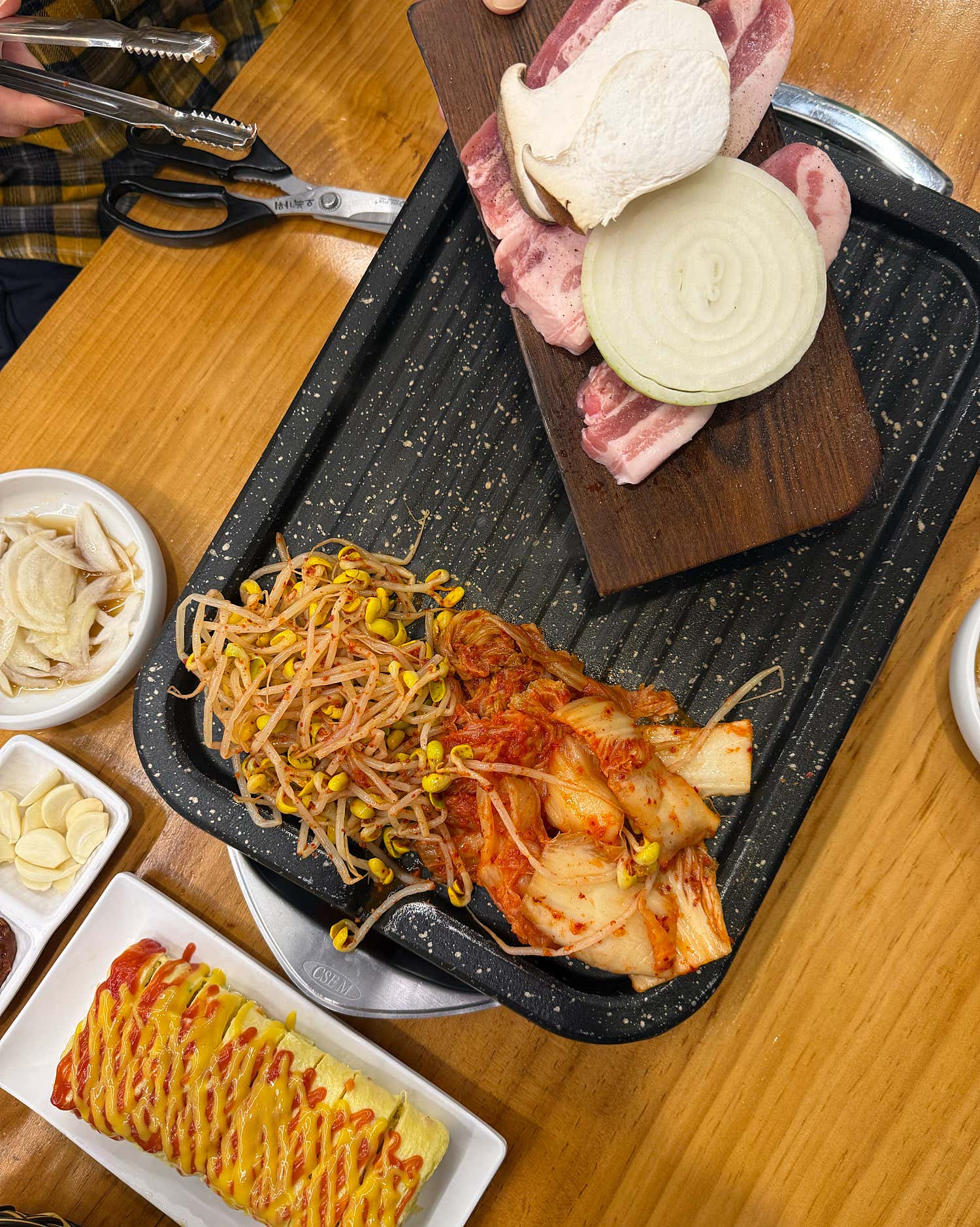 고기를 먹는 동안, 불판 한쪽에 구워지는 김치와 마늘, 버섯 등 푸짐한 사이드 메뉴들의 향연도 빼놓을 수 없습니다. 특히 이곳의 김치는 삼겹살의 느끼함을 싹 잡아주면서 감칠맛을 더해주는 완벽한 파트너였죠.