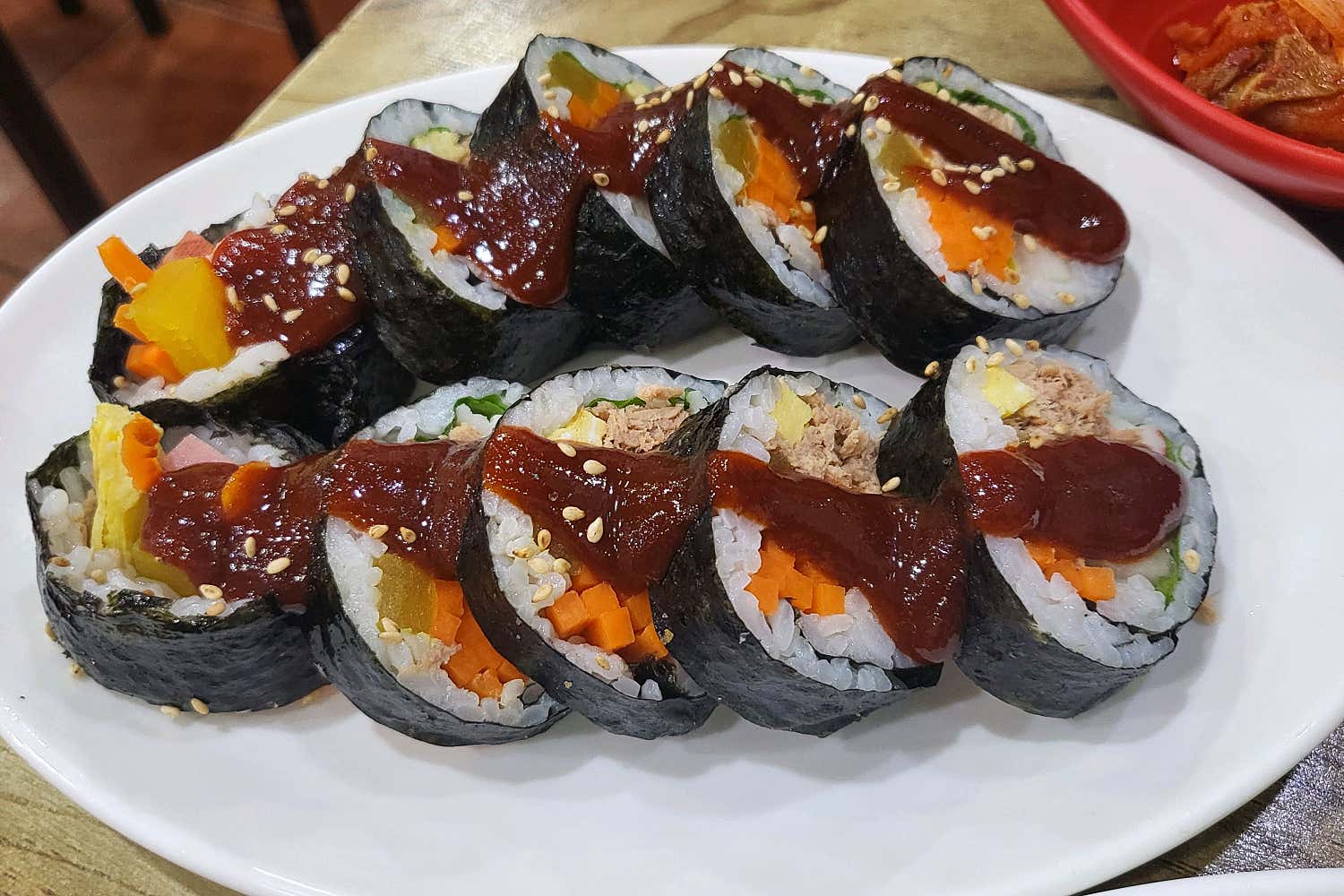 고추장 김밥은 단순한 김밥을 넘어, 떡볶이 국물에 푹 찍어 먹으면 그 풍미가 배가 되는 마성의 메뉴입니다.