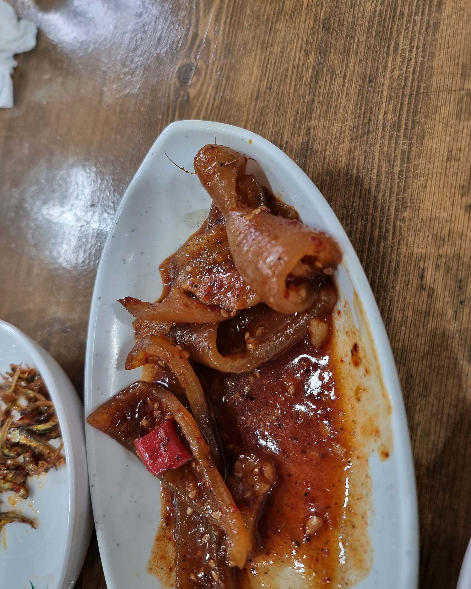 저희는 현지 어르신의 추천대로 백반에 오징어볶음을 추가했습니다. 매콤달콤한 양념에 쫄깃한 오징어 식감이 살아있는 오징어볶음은 백반의 다채로움을 한층 더 끌어올려 주었습니다. 기본 백반의 생선구이와 함께 육해공 완벽한 조합을 이루며, 정말 배불리 맛있게 즐길 수 있었습니다.