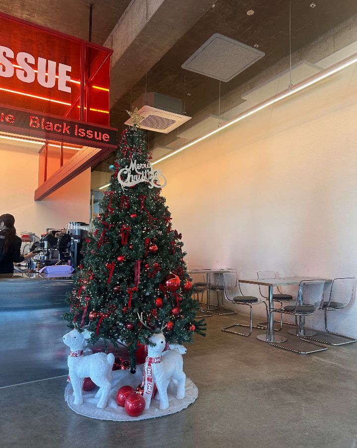 카페 입구에 들어서자마자 눈에 띄는, 붉은색 장식으로 화려하게 꾸며진 크리스마스 트리가 따뜻한 연말 분위기를 더합니다.