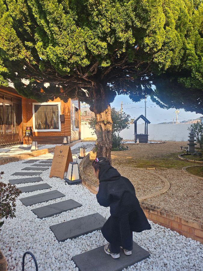 그해 거제 카페 전경: 정갈한 돌길과 푸르른 정원이 어우러진 모습