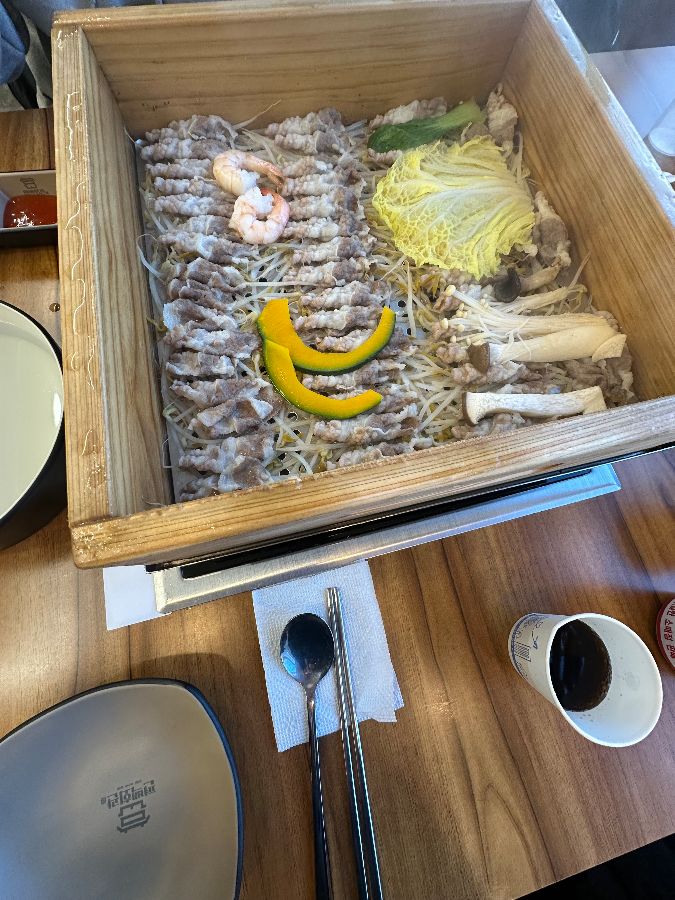 제일 먼저 편백찜부터 맛봤는데요. 편백나무 향이 은은하게 퍼지는 게 정말 예술이에요. 얇게 썰린 소고기와 신선한 채소, 새우, 단호박 등이 편백나무 찜기에 담겨 나오는데, 비주얼부터가 합격점이었어요. 타이머를 맞춰놓고 기다리는 동안 얼마나 설렜는지 몰라요!