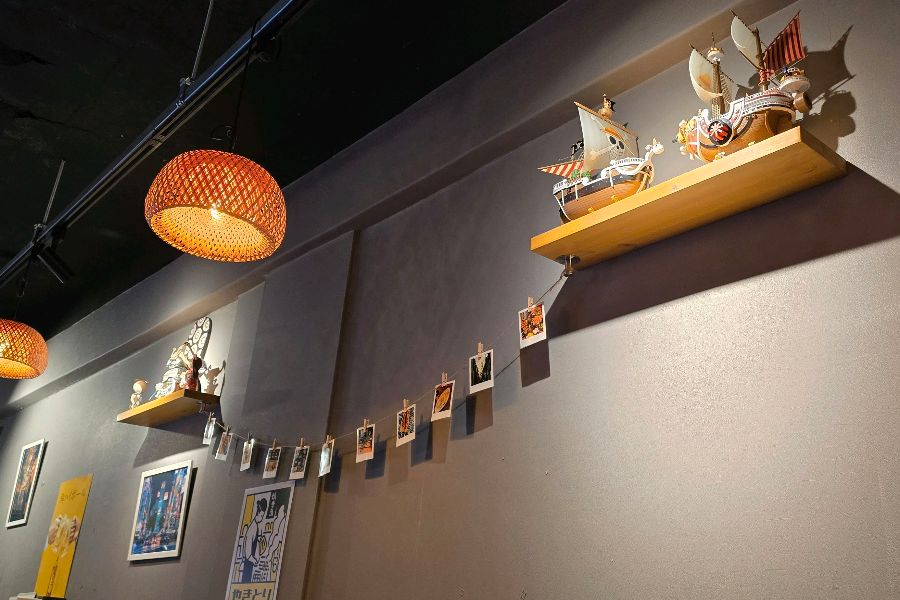 벽면에는 귀여운 소품들과 사진들이 장식되어 있었는데, 마치 작은 갤러리에 온 듯한 느낌도 받았어요. 특히 눈에 띄었던 건 원피스 배 모형이었는데, 사장님의 센스가 돋보이는 부분이었죠. 이런 소소한 부분들이 칸꼬지오만의 개성을 만들어내는 것 같아요.