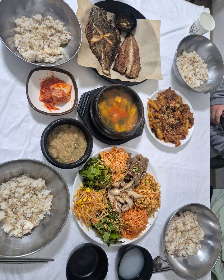 보리밥, 나물, 찌개, 제육볶음까지! 풍성한 한 상 차림에 눈이 즐거워집니다.