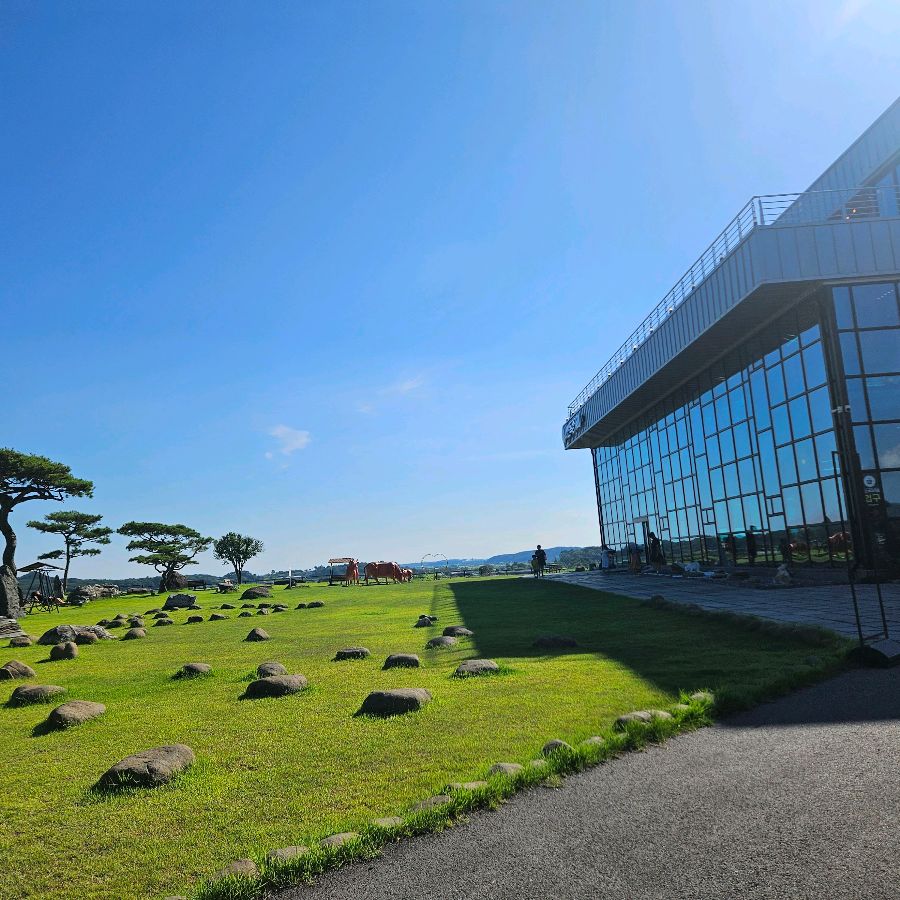 푸른 하늘 아래 넓게 펼쳐진 초원과 카페 건물의 조화로운 모습