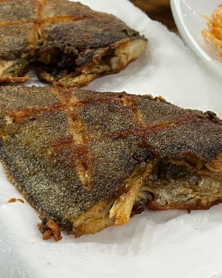 모둠 생선구이는 고등어, 가자미, 조기 등 다양한 종류의 생선이 노릇하게 구워져 나옵니다. 겉은 바삭하고 속은 촉촉한 생선들은 신선함이 그대로 느껴졌습니다. 특히, 짭짤하면서도 고소한 가자미는 밥도둑이 따로 없었습니다. 레몬즙을 살짝 뿌려 먹으니, 생선의 풍미가 더욱 살아나는 듯했습니다.