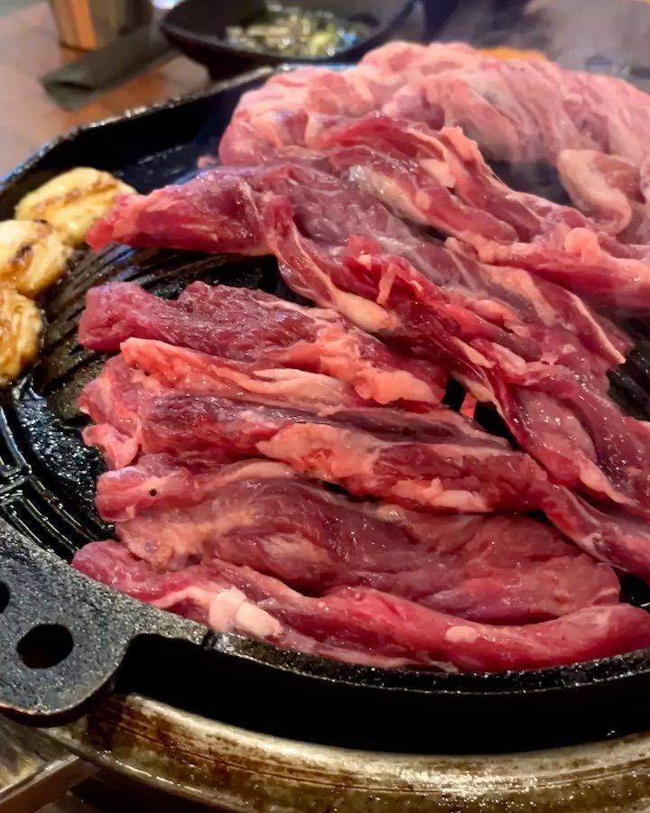 불판 위에서 맛있게 구워지는 양갈비와 치즈